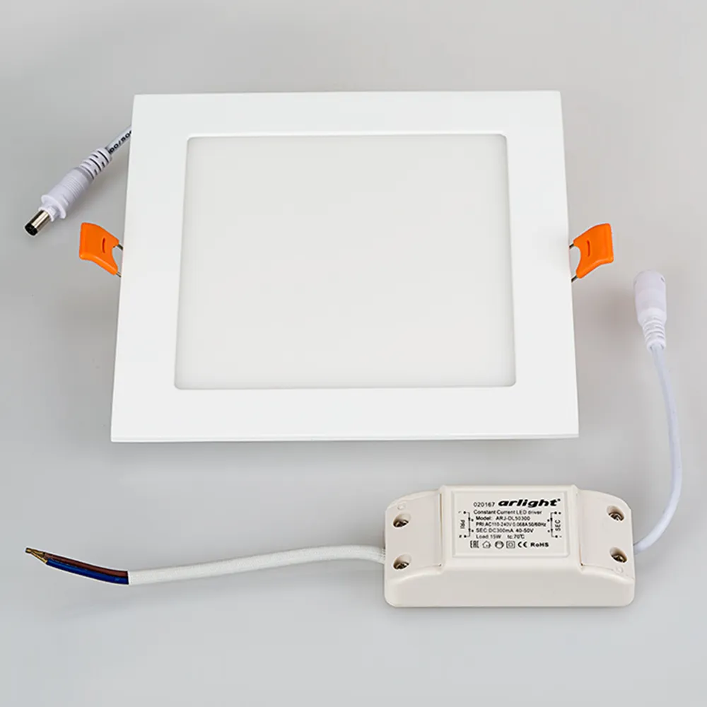 Тонкая панель 15Вт, белый квадратный корпус. Цвет ТЕПЛЫЙ БЕЛЫЙ 3000K, св.поток 1125-1200лм, CRI(Ra)>80, угол 120°. Размер 172x172мм, высота корпуса 13мм, установка в отверстие 160x160мм. Питание AC 180-240V, 15Вт, драйвер в комплекте (DC300mA, 40-50V).