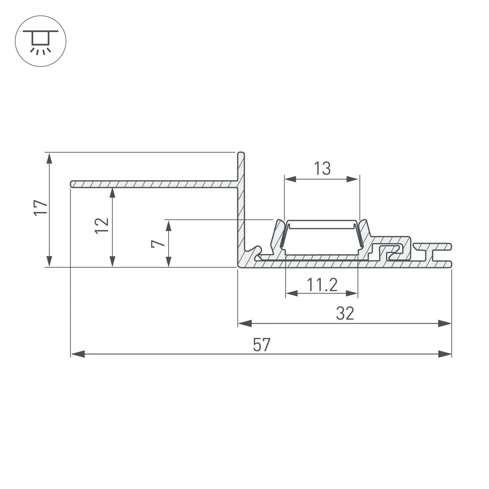 Алюминиевый профиль для светодиодных лент и линеек, для подсветки потолочных ниш. "Тонкий край" под финишную отделку. Луч света направлен перпендикулярно плоскости потолка. В комплекте: основание, профиль, силиконовый уплотнительный шнур. Габаритные размеры (L×W×H): 2000x57x17 мм. Ширина площадки для ленты 10 мм. Экраны, заглушки и другие аксессуары приобретаются отдельно. Цена за 1 метр.