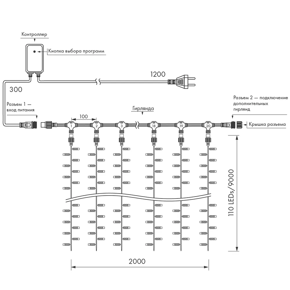 Светодиодный Занавес Classic. Размер 2000x9000 мм (длина 2000 мм, высота 9000 мм). 20 ниспадающих нитей длиной 9000 мм. 2200 светодиодов размером 7 мм. Цвет свечения ТЕПЛЫЙ БЕЛЫЙ (3000 К), постоянное свечение и 8 динамических эффектов с резким световым рисунком (прозрачная вогнутая линза). Провод прозрачный, ПВХ. Питание 230 В, Мощность 120 Вт, защита IP65, применение в помещении и на улице под навесом. Аксессуар для подключения и выбора режима свечения в комплекте.