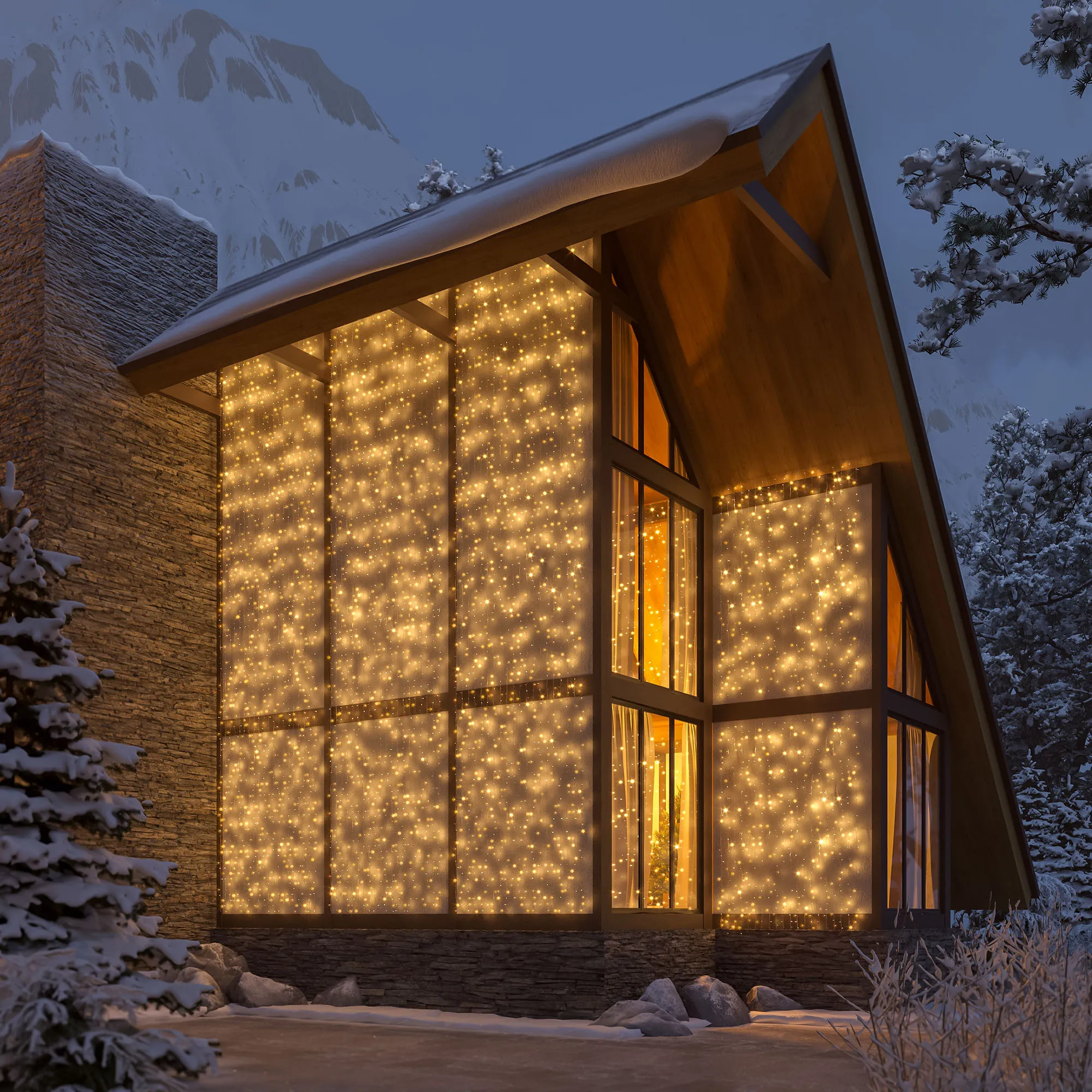 Светодиодный занавес Classic. Размер 2000x9000 мм (длина 2000 мм, высота 9000 мм). 20 ниспадающих нитей длиной 9000 мм. Цвет светодиодов ТЕПЛЫЙ БЕЛЫЙ (3000 К), динамический эффект "водопад". 2200 светодиодов размером 7 мм с резким световым рисунком (прозрачная вогнутая линза). Провод прозрачный, ПВХ. Питание 230 В, Мощность 180 Вт, защита IP65, применение в помещении и на улице под навесом. Аксессуары для подключения в комплекте.
