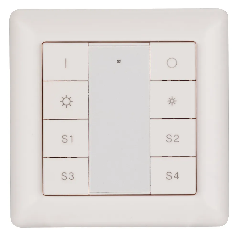 Встраиваемая кнопочная белая пластиковая панель для работы по протоколу DALI. Включение/выключение, диммирование, вызов и сохранение 4-х сцен в 1 группе. Установка номера группы и номера первой сцены выполняется переключателями на корпусе. Питание от шины DALI (4 мА). Стандартная рамка входит в комплект поставки.