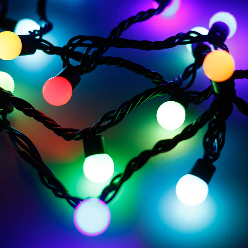 Светодиодные шарики Pro. Размер 20000 мм. Цвет светодиодов RGBY, эффект динамики (автоматическая быстрая смена цвета свечения). 200 шариков со светодиодом внутри размером 17.5 мм с мягким световым рисунком (выпуклая молочно-белая линза). Провод чёрный, каучук. Питание 230 В, Мощность 14 Вт, защита IP65, применение в помещении и на улице под навесом. Аксессуары для подключения приобретаются отдельно.