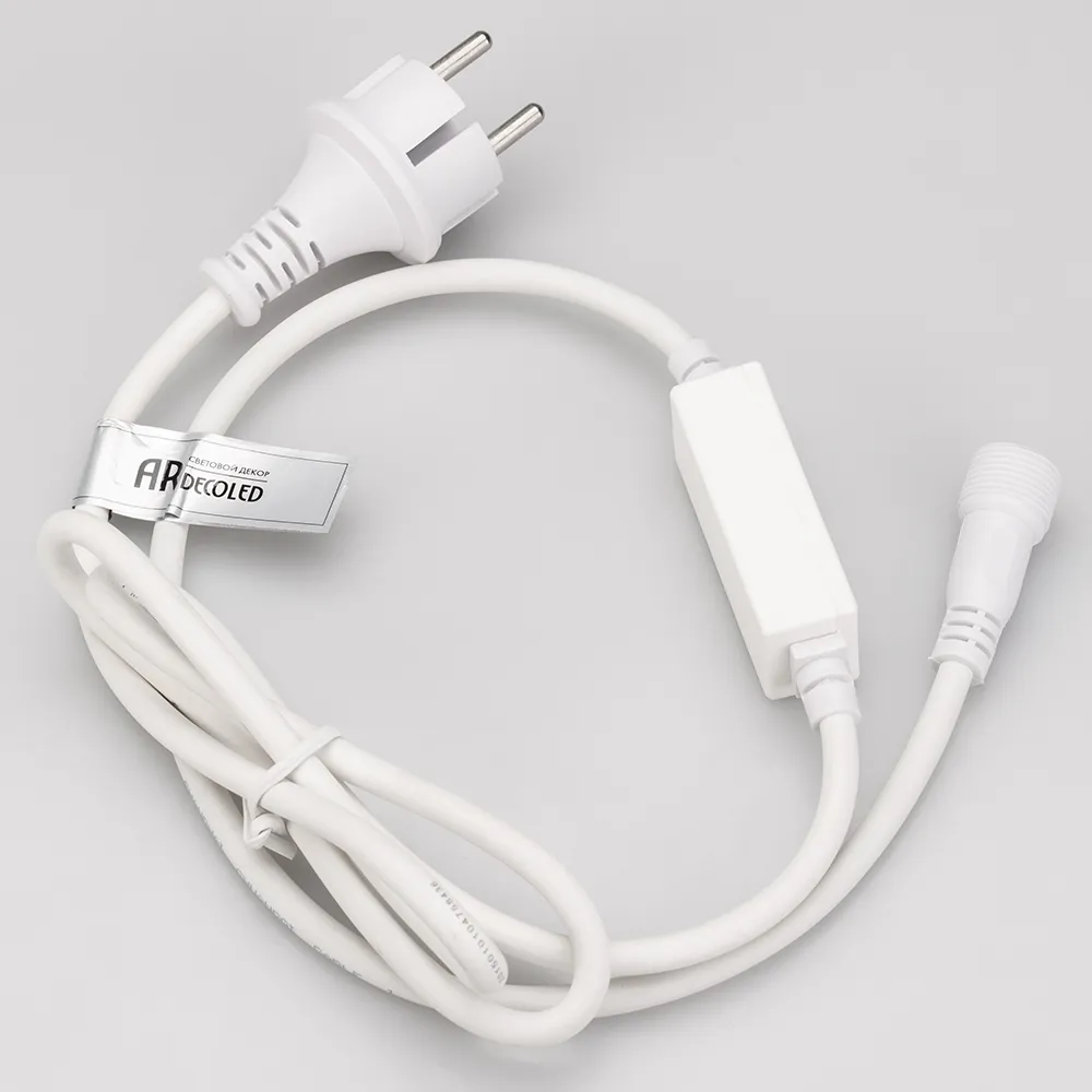 Шнур питания для светодиодных гирлянд постоянного свечения. Материал оболочки ПВХ. Цвет провода белый. В комплект входит: шнур питания с вилкой европейского стандарта (IP44), 2pin разъём подключения к гирлянде, выпрямитель AC/DC (1.6A). Длина провода 1.5 метра.
