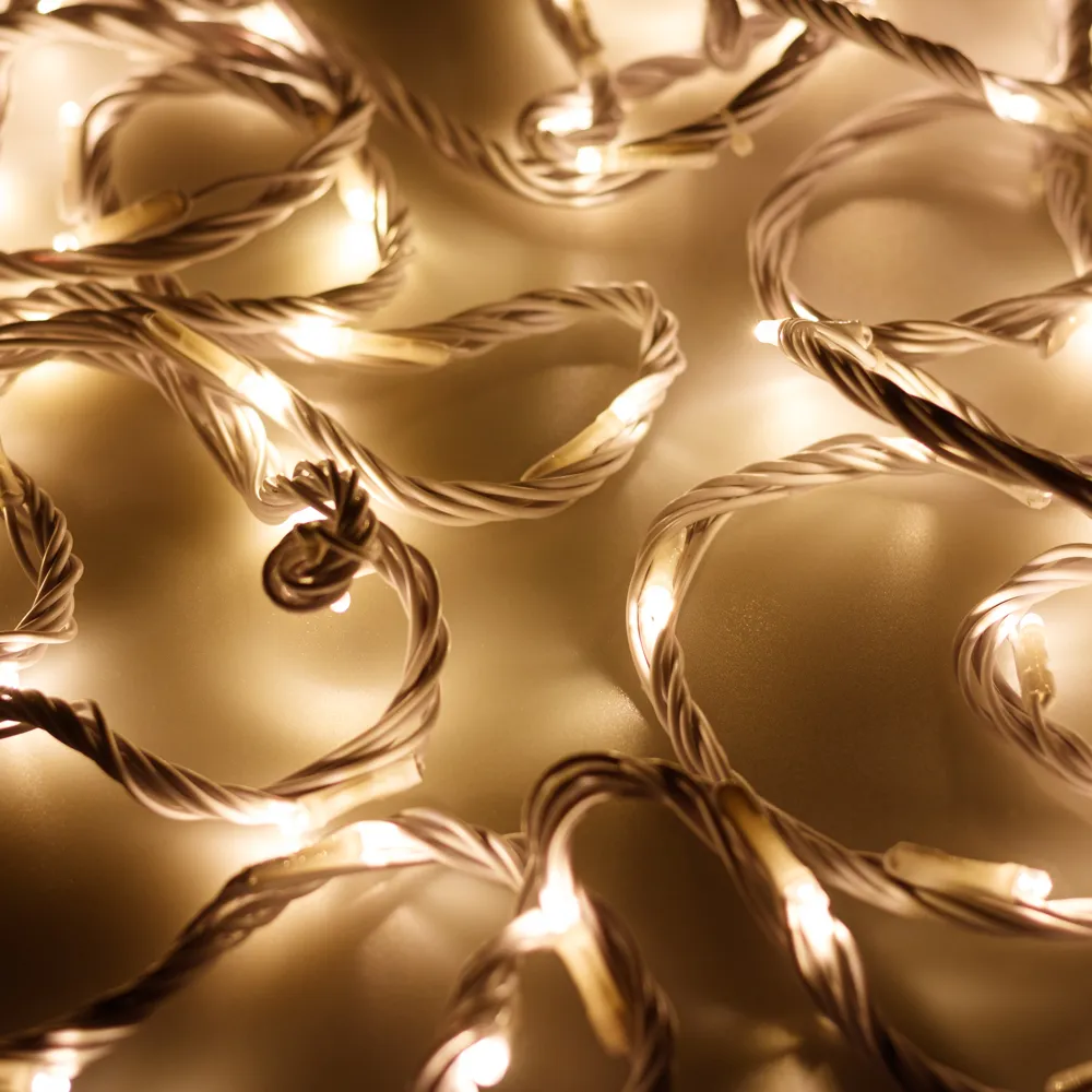 Светодиодная нить Home. Размер 10000 мм. Цвет свечения ТЕПЛЫЙ БЕЛЫЙ (3000 К). 99 светодиодов размером 5 мм с динамическими и статическими эффектами свечения с резким световым рисунком (прозрачная вогнутая линза). Эффект "Бегущий огонь" по всей длине нити, смена эффектов и управление осуществляется с помощью контроллера с пультом. Провод белый, ПВХ. Питание 230 В, Мощность 10.5 Вт, защита IP20, применение в помещении. Аксессуары для подключения и управления идут в комплекте.