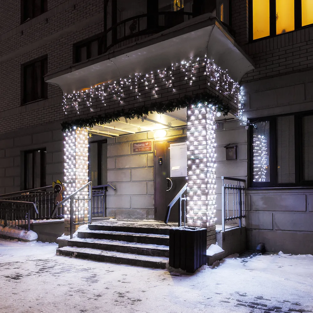 Светодиодная бахрома Pro. Размер 4000 мм (длина 4000 мм, по длине 32 нити высотой 200/600 мм). Количество светодиодов 128 шт размером 7 мм. Основной цвет свечения БЕЛЫЙ (6000 К), эффект мерцания редких точек БЕЛЫЙ (6000К) с резким световым рисунком (прозрачная вогнутая линза), соотношение светодиодов: 106 белых постоянного свечения / 22 белых с мерцанием. Эффект частого мерцания. Провод черный, каучук. Питание 230 В, Мощность 6 Вт, защита IP65, применение на улице под навесом. Аксессуары для подключения приобретаются отдельно.