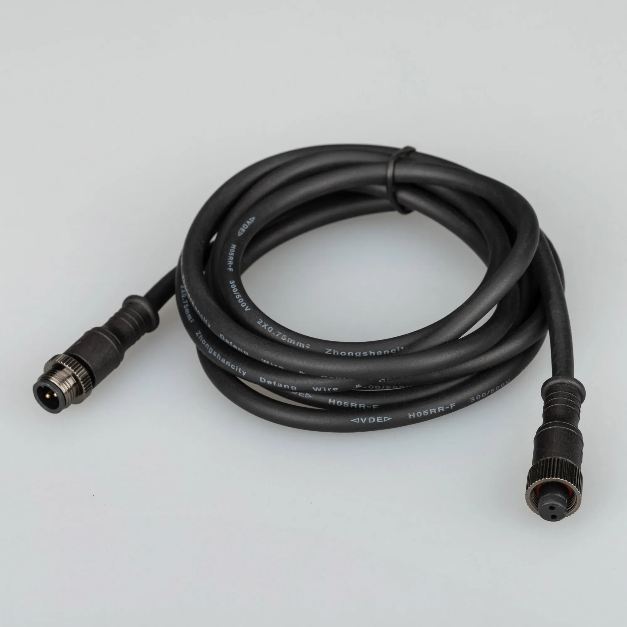 Водонепроницаемый IP67 прямой коннектор для соединения светильников ART-LUMILINE. Цвет черный. Длина 2000мм, сечение 0.75мм2 . Один конец - male коннектор 2pins Ø15, другой конец- female коннектор 2 pins Ø15