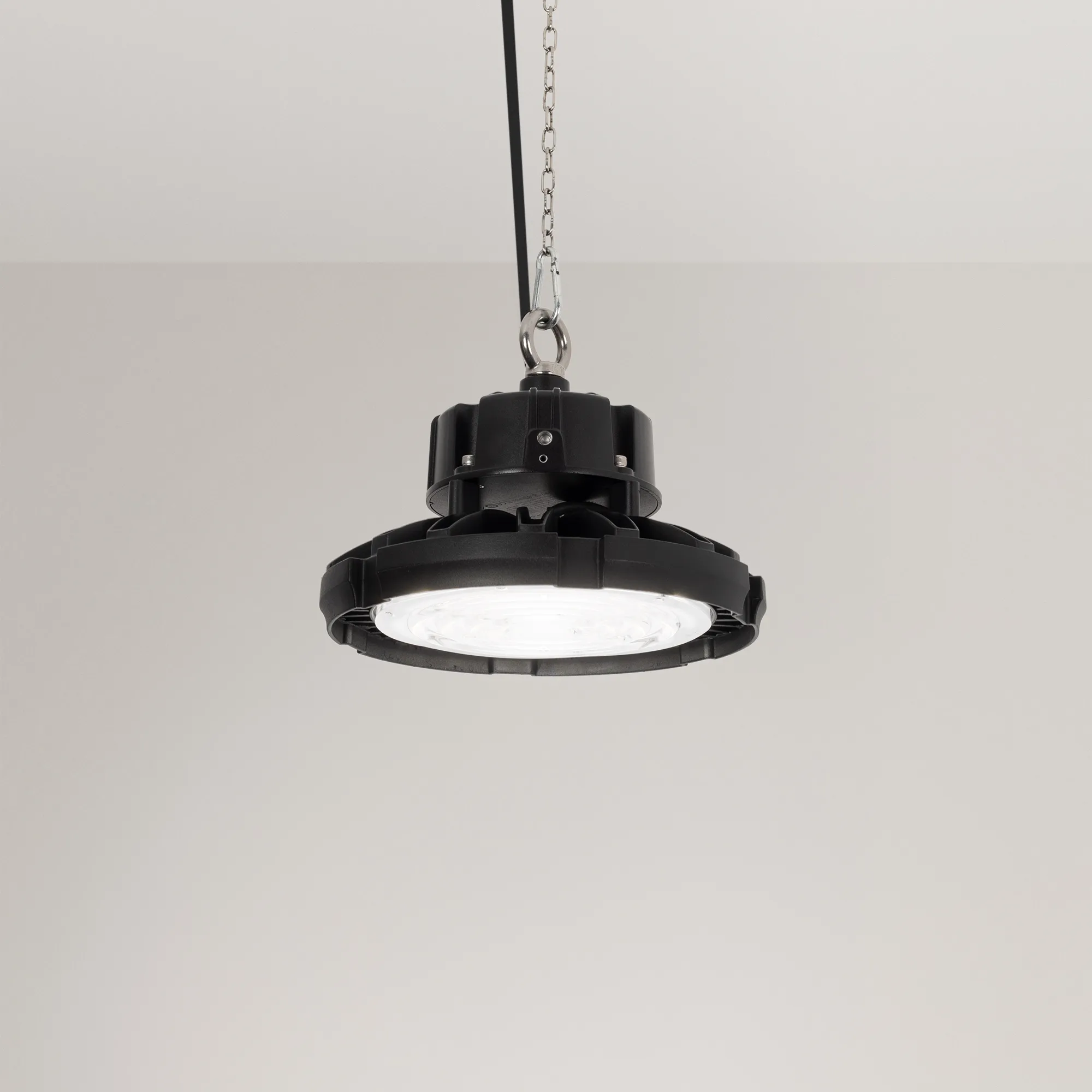 Поставка под заказ от 200 шт. Светильник для освещения складских и промышленных помещений. Мощность 100W, напряжение питания AC 220-240V/50Hz. CRI 80. Тип светодиодов SMD2835, с групповой оптической линзой. Цвет свечения ДНЕВНОЙ 5000K, световой поток 14000 Lm, угол рассеивания 90°. Цвет корпуса черный, линза из поликарбоната, степень влагозащиты IP65. Габариты Ф245xH188мм. Рым-болт в комплекте.