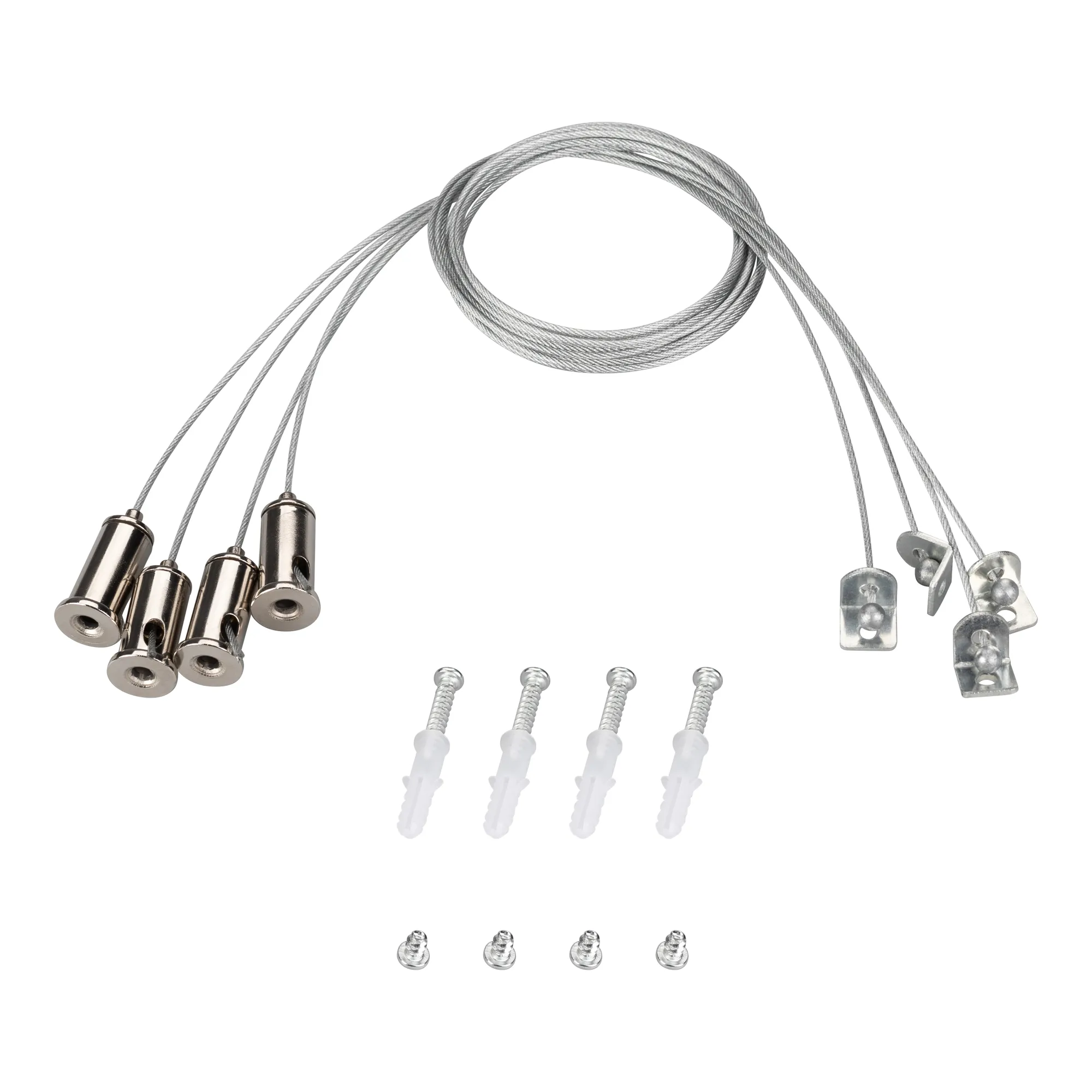 Набор для подвешивания панелей 600х600 мм. В комплекте 4 тросика с держателями, саморезы с дюбелями 4шт., винты для крепления 4 шт. Длина троса 1 метр. Максимальная нагрузка 8 кг.