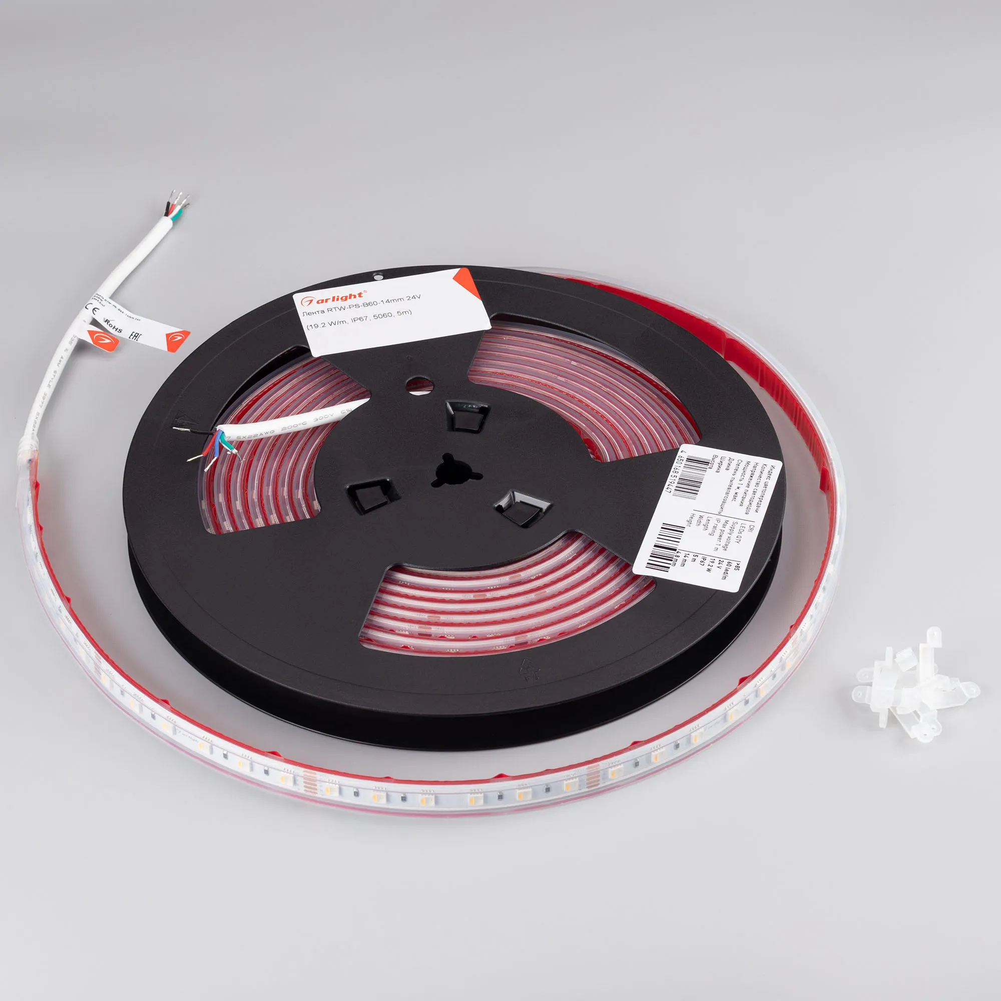 Светодиодная герметичная лента RTW серии B60, IP67 (PS - силиконовая экструзия). Светодиоды 5060 4-in-1, 60 шт/м, белая плата шириной 12 мм, скотч 3M. Цвет RGB + БЕЛЫЙ 6000K, индекс цветопередачи CRI>85, угол 120°. Питание 24 В, мощность 19.2 Вт/м (96 Вт на 5 м). Размеры 5000x14x4.8 мм. Мин. отрезок 100 мм, 6 светодиодов. Цена за 1 м.