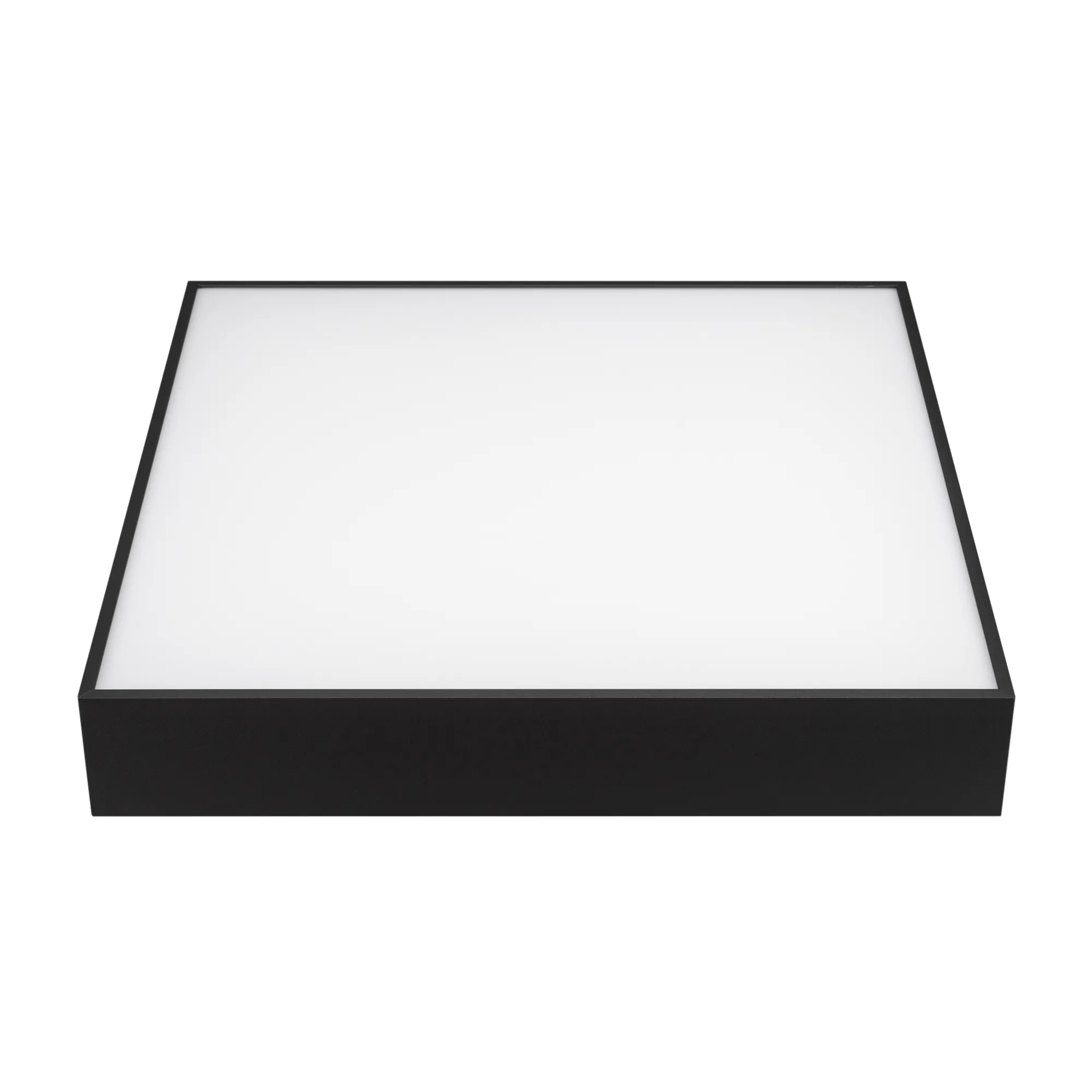 Накладной светильник. Мощность 40 Вт, св. поток 2590-3200 лм, 80 лм/Вт, дневной 4000 K, CRI>90, угол 120°, напряжение питания 230 В. Черный квадратный корпус из алюминия, экран PC, степень защиты IP40. Размер: длина 400 мм, ширина 400 мм, высота 64 мм. Монтаж накладной. Драйвер 27-40 В, 1000 мА, пульсация <5%.