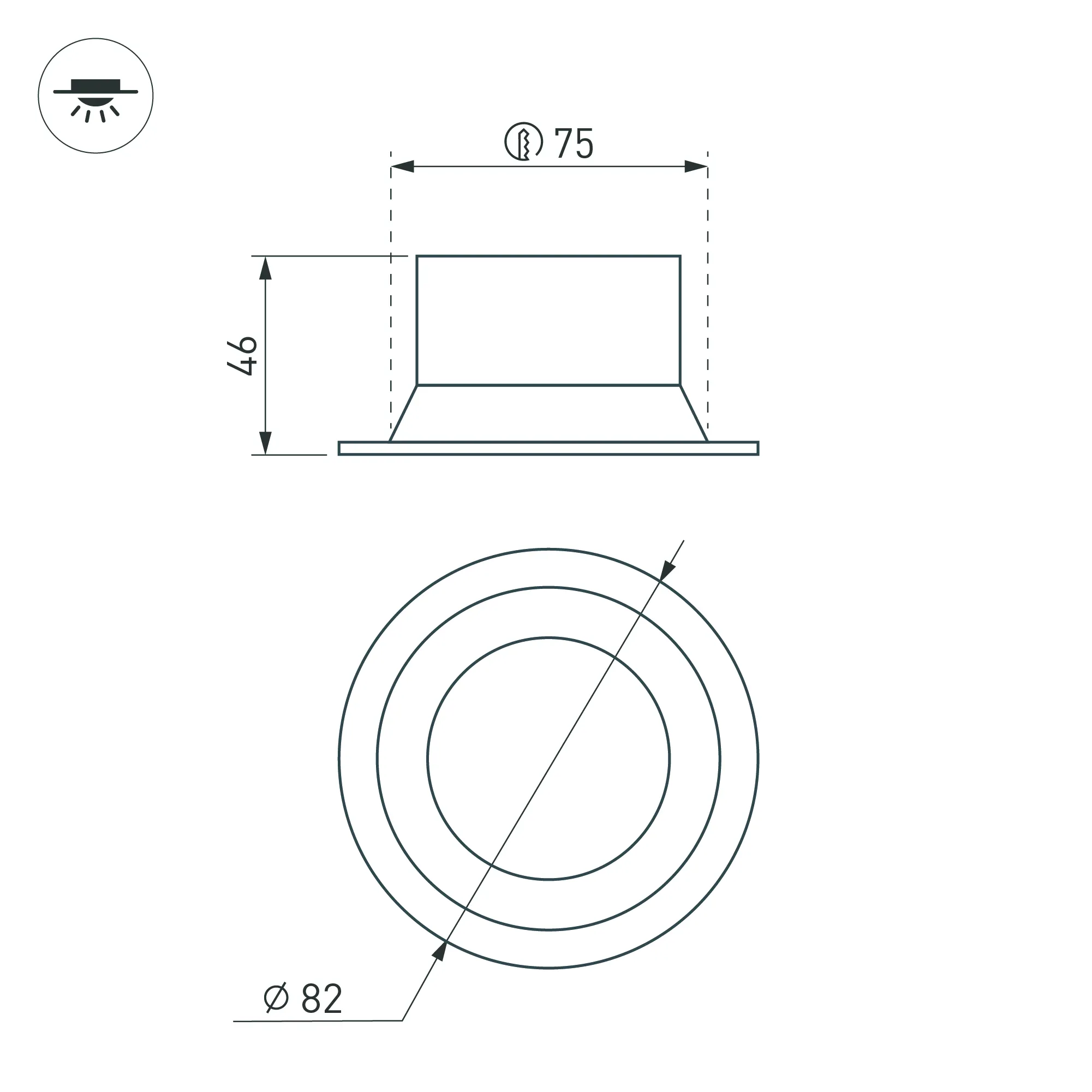 Встраиваемый светильник даунлайт. Мощность 9 Вт, св. поток 500 лм, 56 лм/Вт, дневной 4000 K, CRI>90, угол 80°, напряжение питания 230 В. Чёрный круглый корпус из алюминия, степень защиты IP20. Размер: диаметр 82 мм, высота 46 мм. Монтаж встраиваемый, установочное отверстие: диаметр 75 мм. Драйвер 27-42 В, 200 мА, пульсация <2%.