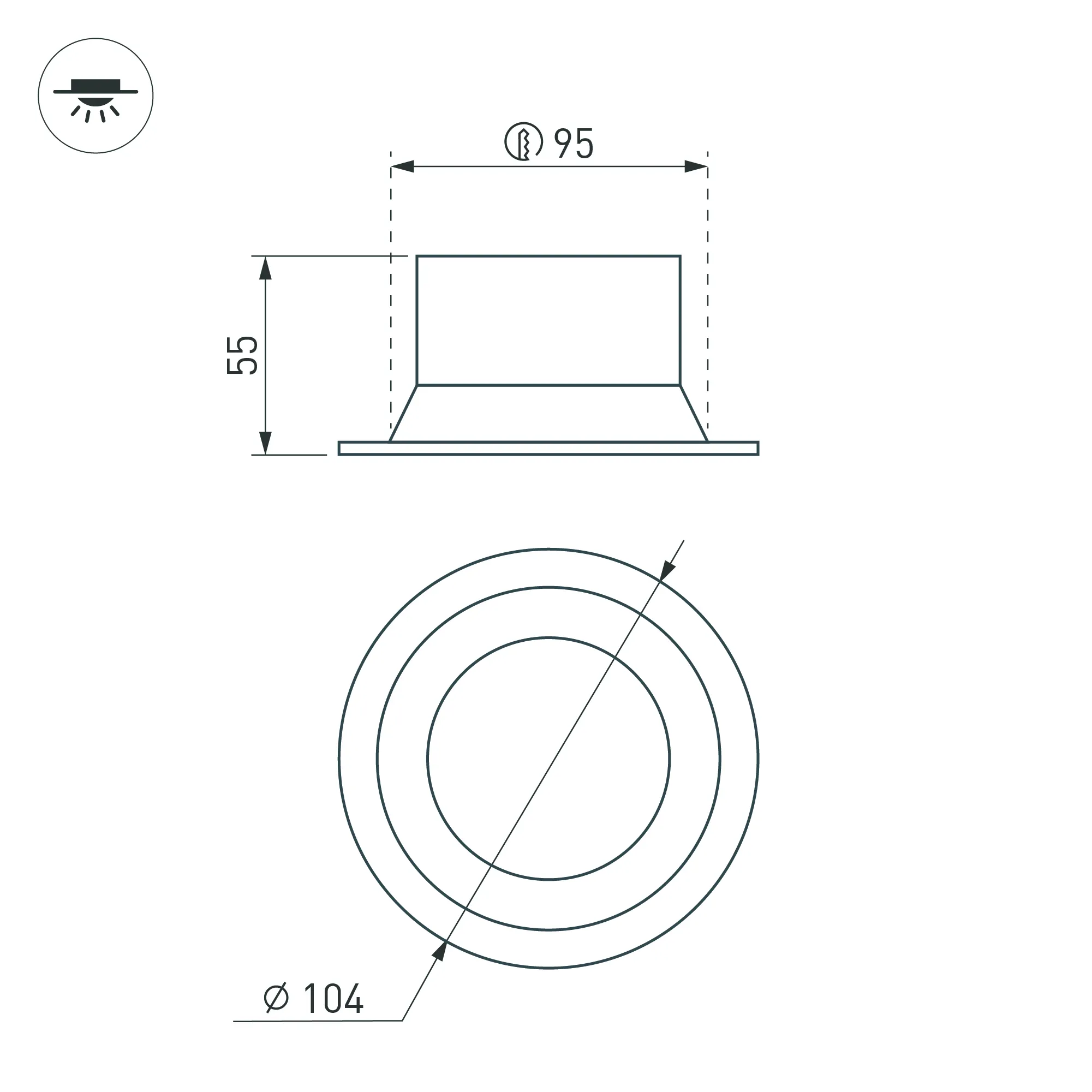 Встраиваемый светильник даунлайт. Мощность 12 Вт, св. поток 840 лм, 70 лм/Вт, дневной 4000 K, CRI>90, угол 90°, напряжение питания 230 В. Белый круглый корпус из алюминия, степень защиты IP20. Размер: диаметр 104 мм, высота 55 мм. Монтаж встраиваемый, установочное отверстие: диаметр 95 мм. Драйвер 27-42 В, 300 мА, пульсация <2%.