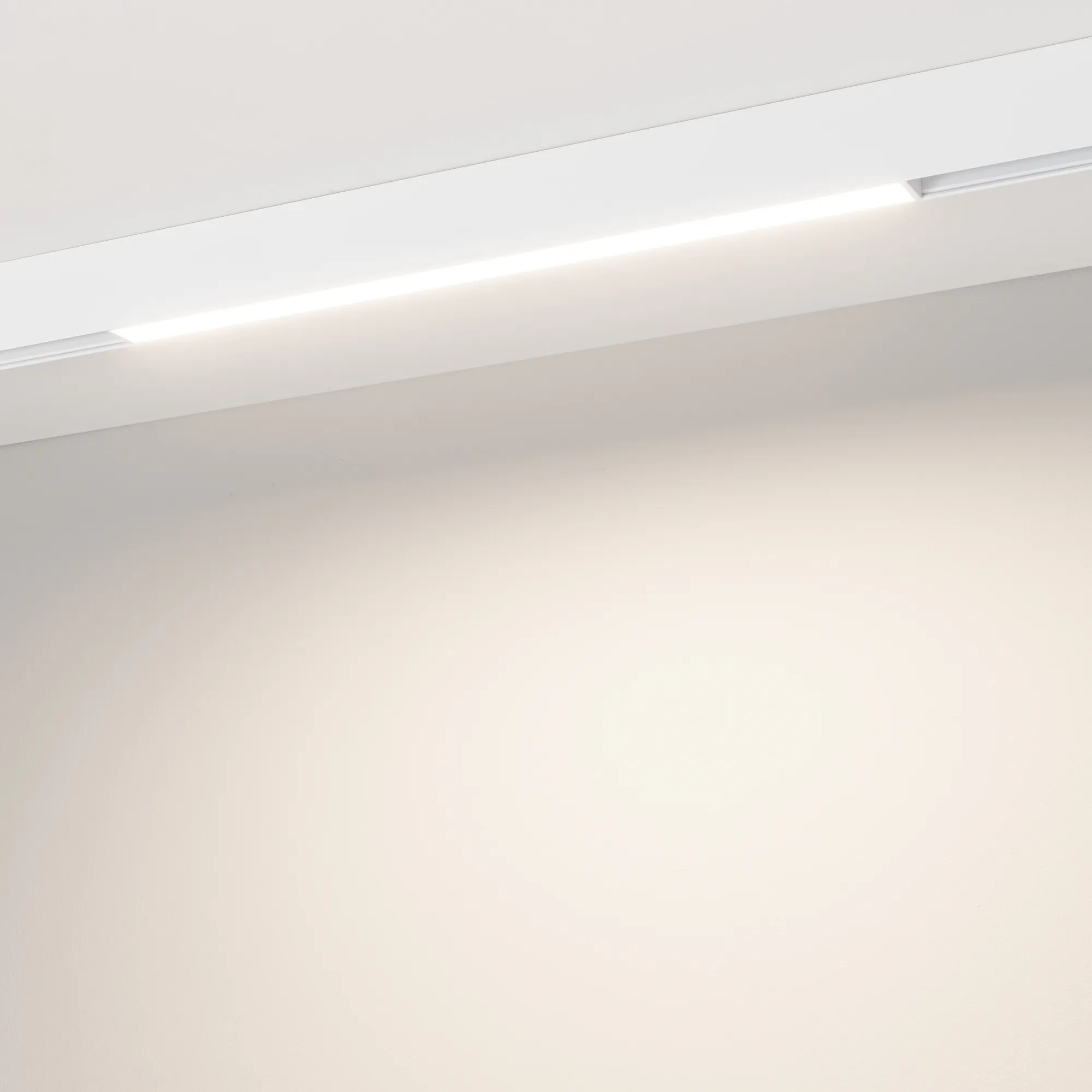 Светильник для магнитных треков MAG-ORIENT шириной 26 мм с управлением DALI. Мощность 16 Вт, св. поток 860 лм, 54 лм/Вт, дневной 4000 K, CRI>90, угол 80°, напряжение питания 48 В. Белый прямоугольный корпус из металл, экран поликарбонат, степень защиты IP20. Размер: длина 462 мм, ширина 22 мм, высота 42 мм. Монтаж на трек MAG-ORIENT. Пульсация <1%.