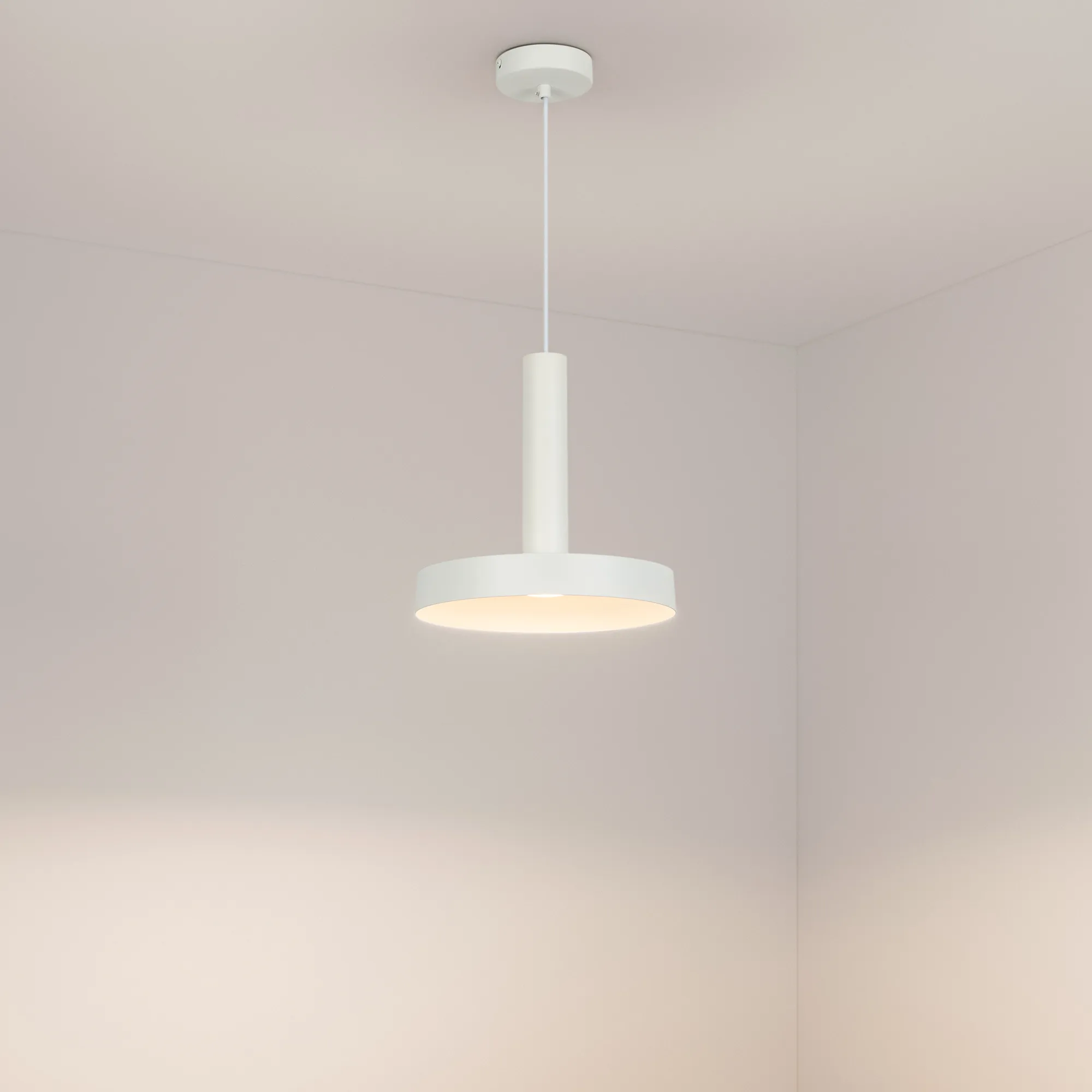 Подвесной светильник. Мощность 8 Вт, св. поток 650 лм, 89 лм/Вт, дневной 4000 K, CRI>80, угол 120°, напряжение питания 230 В. Белый круглый корпус из алюминия, рассеиватель каленое матовое стекло , степень защиты IP20. Размер: диаметр 250 мм, высота основания 40 мм, общая высота 260 мм. Монтаж подвесной, длина подвеса 1500 мм, регулируемая. Габариты чаши Ø120x30 мм. Драйвер 12-20 В, 300 мА, пульсация <5%.