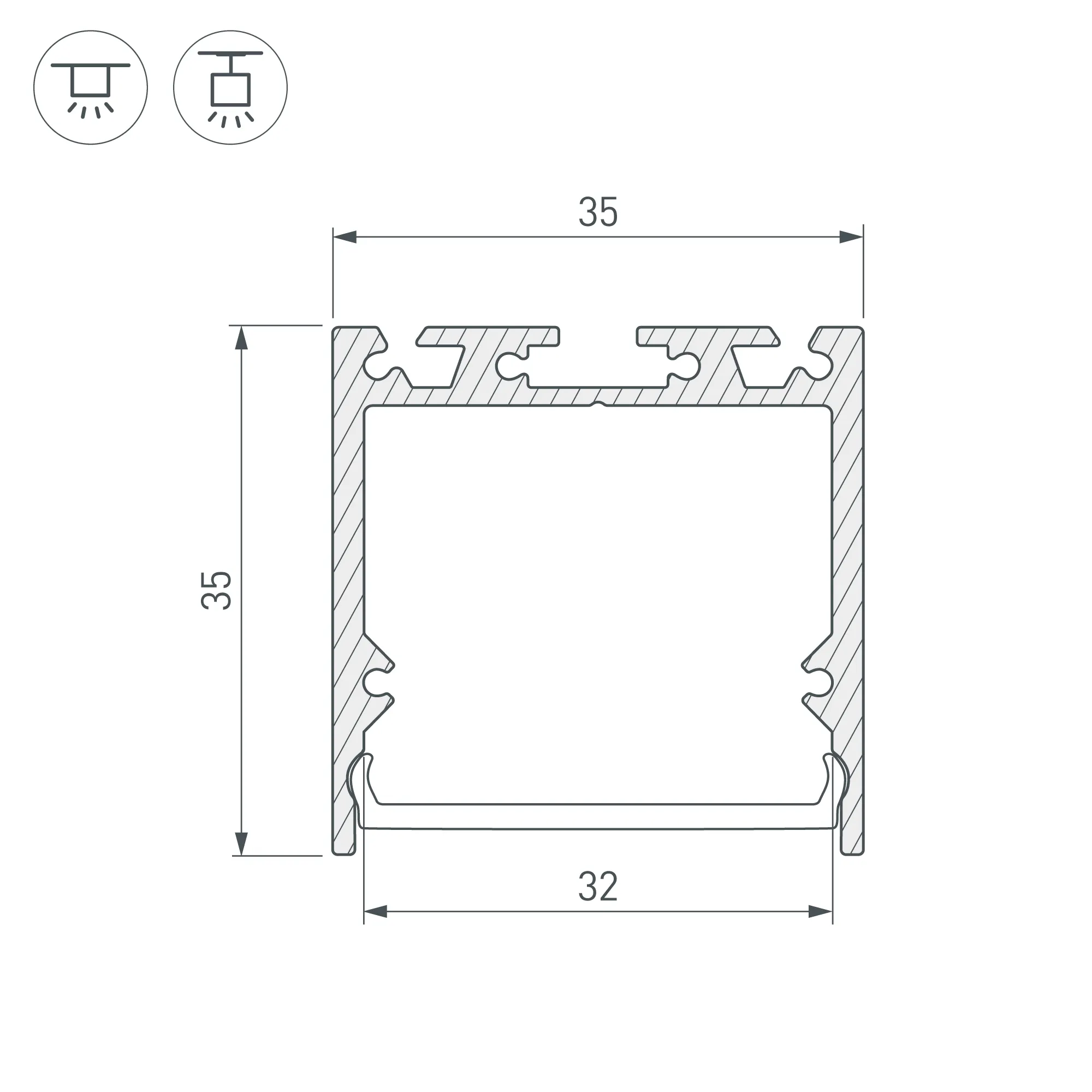 Комплект с экраном. Алюминиевый профиль для светодиодных лент и линеек. Цвет - белый RAL9003 (порошковая окраска). Габаритные размеры (L×W×H): 2500x35x35 мм. Ширина площадки для ленты 31 мм. Аксессуары приобретаются отдельно.