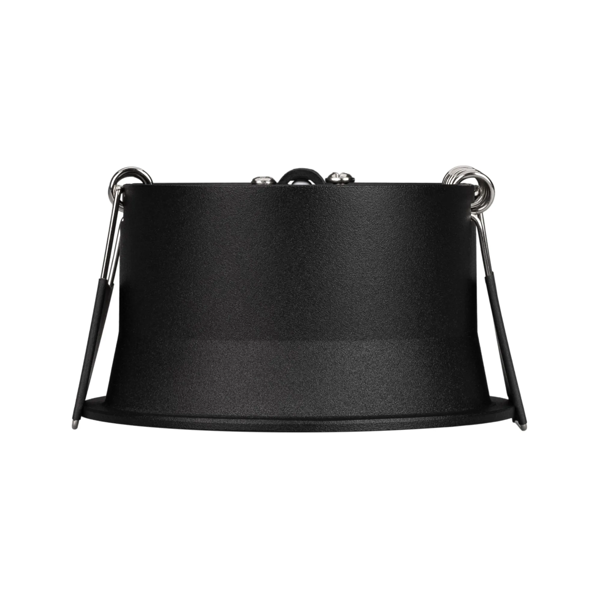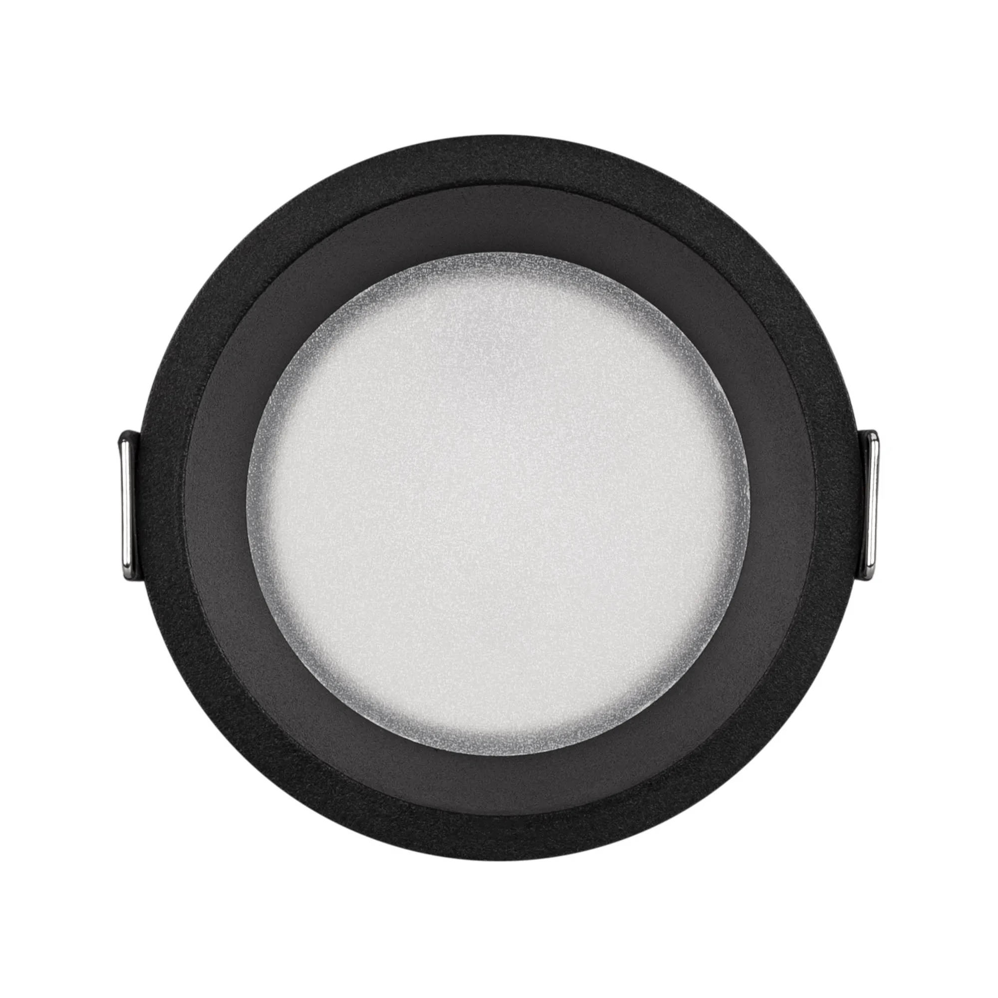 Встраиваемый светильник даунлайт. Мощность 9 Вт, св. поток 500 лм, 56 лм/Вт, тёплый 3000 K, CRI>90, угол 80°, напряжение питания 230 В. Чёрный круглый корпус из алюминия, степень защиты IP20. Размер: диаметр 82 мм, высота 46 мм. Монтаж встраиваемый, установочное отверстие: диаметр 75 мм. Драйвер 27-42 В, 200 мА, пульсация <2%.