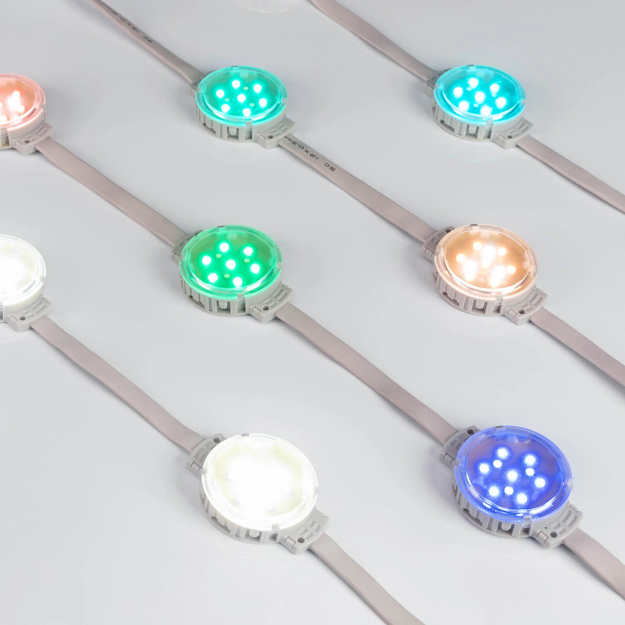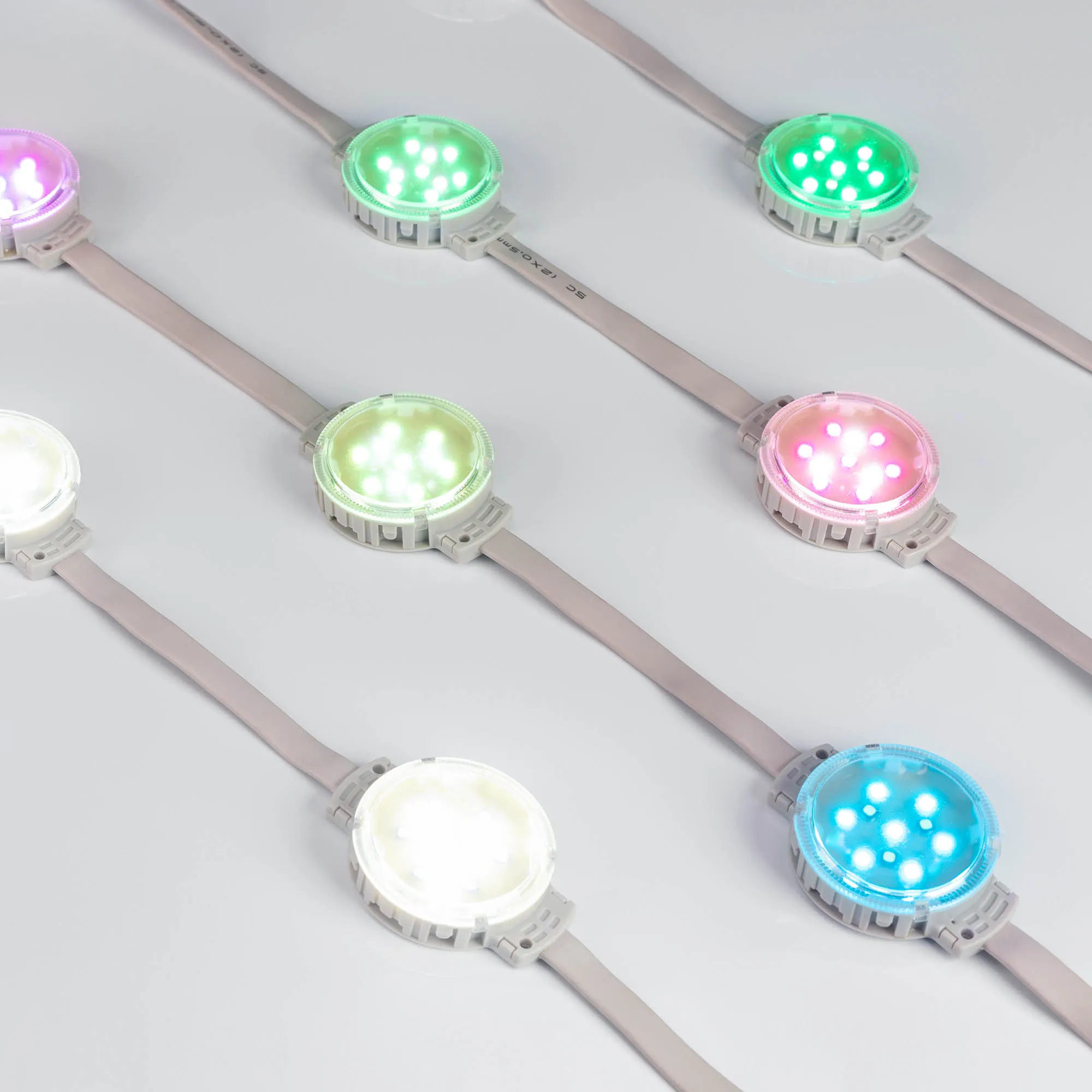 Управляемый светодиодный модуль DMX, RGBW, микросхема UCS512C3, напряжение 24 В, мощность 2 Вт, 10 светодиодов RGB SMD 3535, 3 светодиода White 6000K SMD 3535, угол 120°. Создание медиафасадов, 30 шт на проводе, расстояние между центрами модулей 170 мм, длина провода между модулями 105 мм. Степень пылевлагозащиты IP68. Размер Ø50×66×15 мм. Гарантия 3 года.