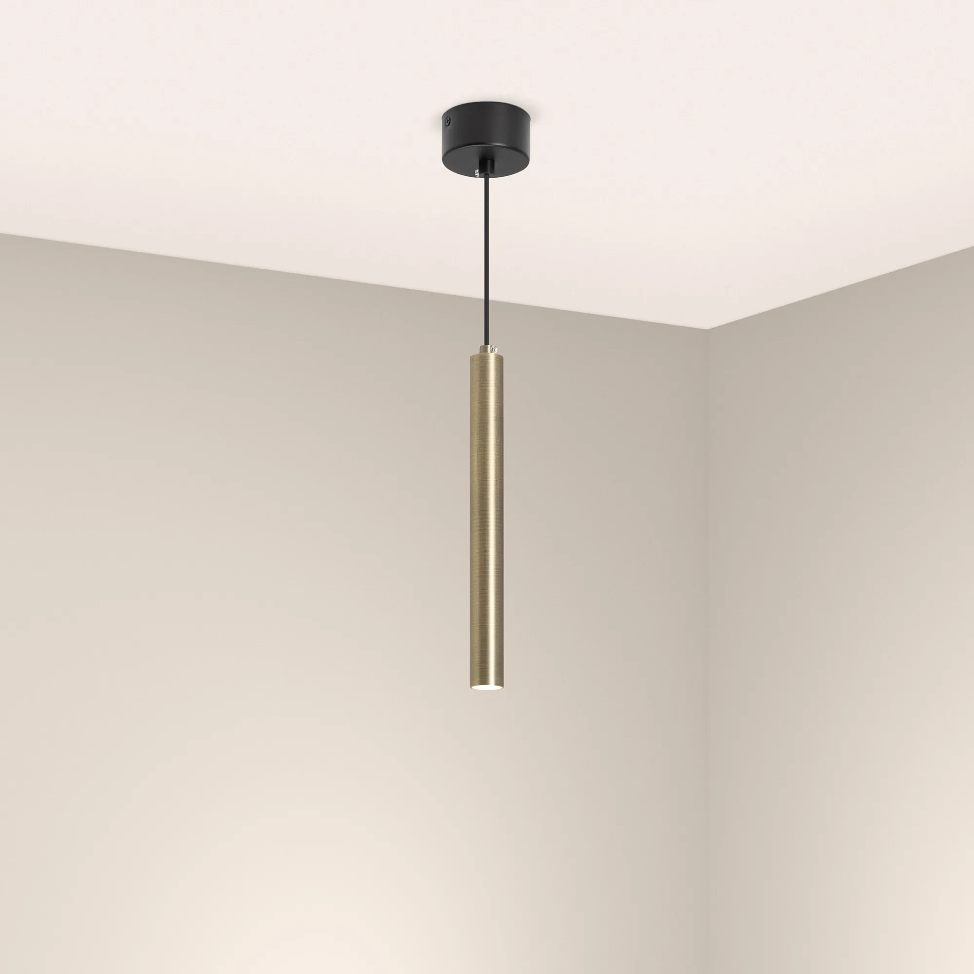 Поставка под заказ от 45 шт. Подвесной светильник. Мощность 9 Вт, св. поток 561 лм, 64 лм/Вт, дневной 4000 K, CRI>90, угол 24°, напряжение питания 230 В. Бронзовый круглый корпус из алюминия, рассеиватель PC, степень защиты IP20. Размер: диаметр 30 мм, длина 300 мм, размер чаши: диаметр 80 мм, высота 40 мм. Монтаж подвесной, длина подвеса 1500 мм. Драйвер 28-42 В, 200 мА, пульсация <1%.