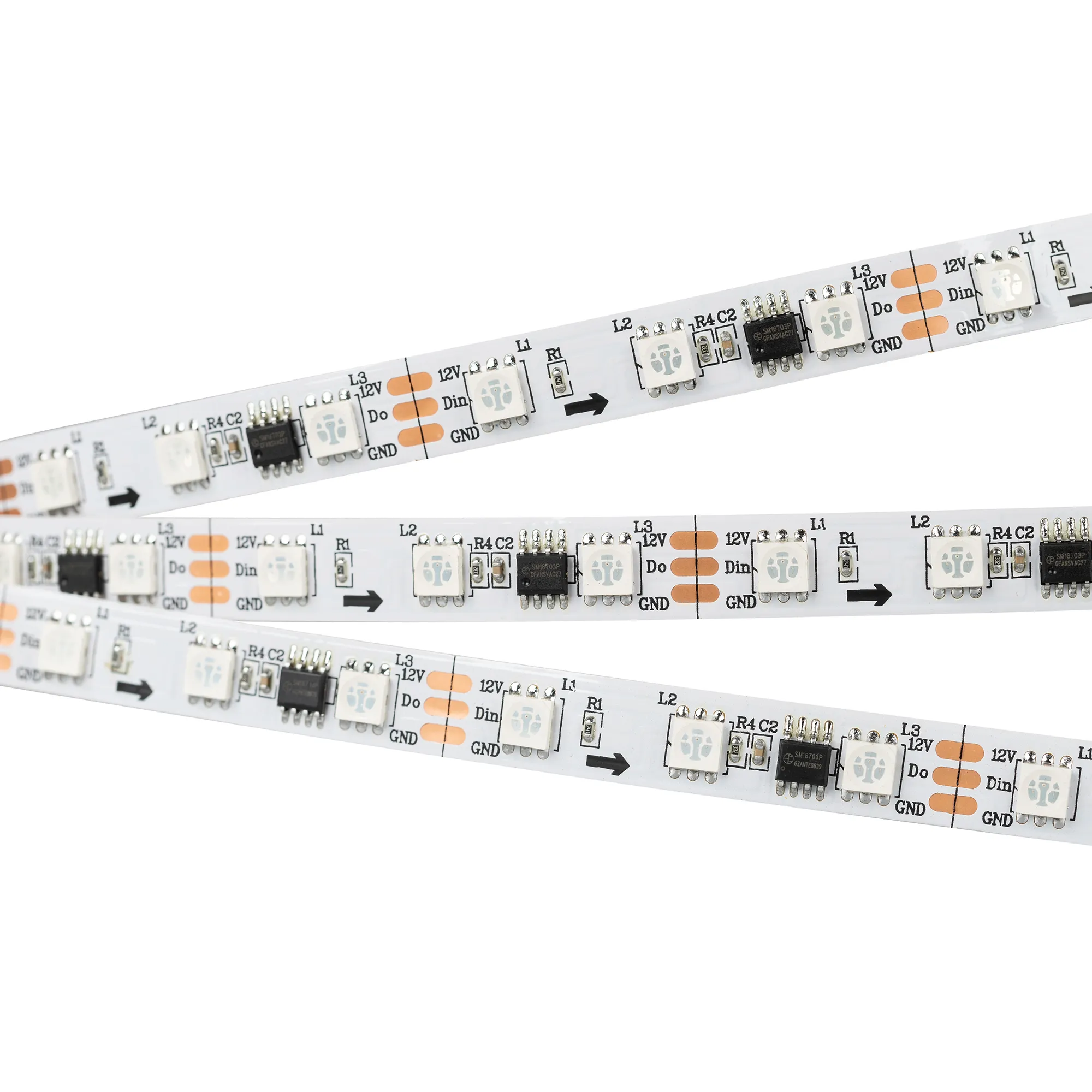 Светодиодная лента SPI серии B60 с микросхемой 16703. Светодиоды SMD 5060, 60 шт/м, 20 pixels на 1 м (100 pixels на 5 м), 1 pixel = 3 светодиода, белая плата шириной 10 мм, скотч 3М. Цвет RGB, угол 120°. Питание 12 В, мощность 14.4 Вт/м (72 Вт на 5 м). Размеры 5000x10x2.4 мм. Мин. отрезок 50 мм, 3 светодиода. Цена за 1м.