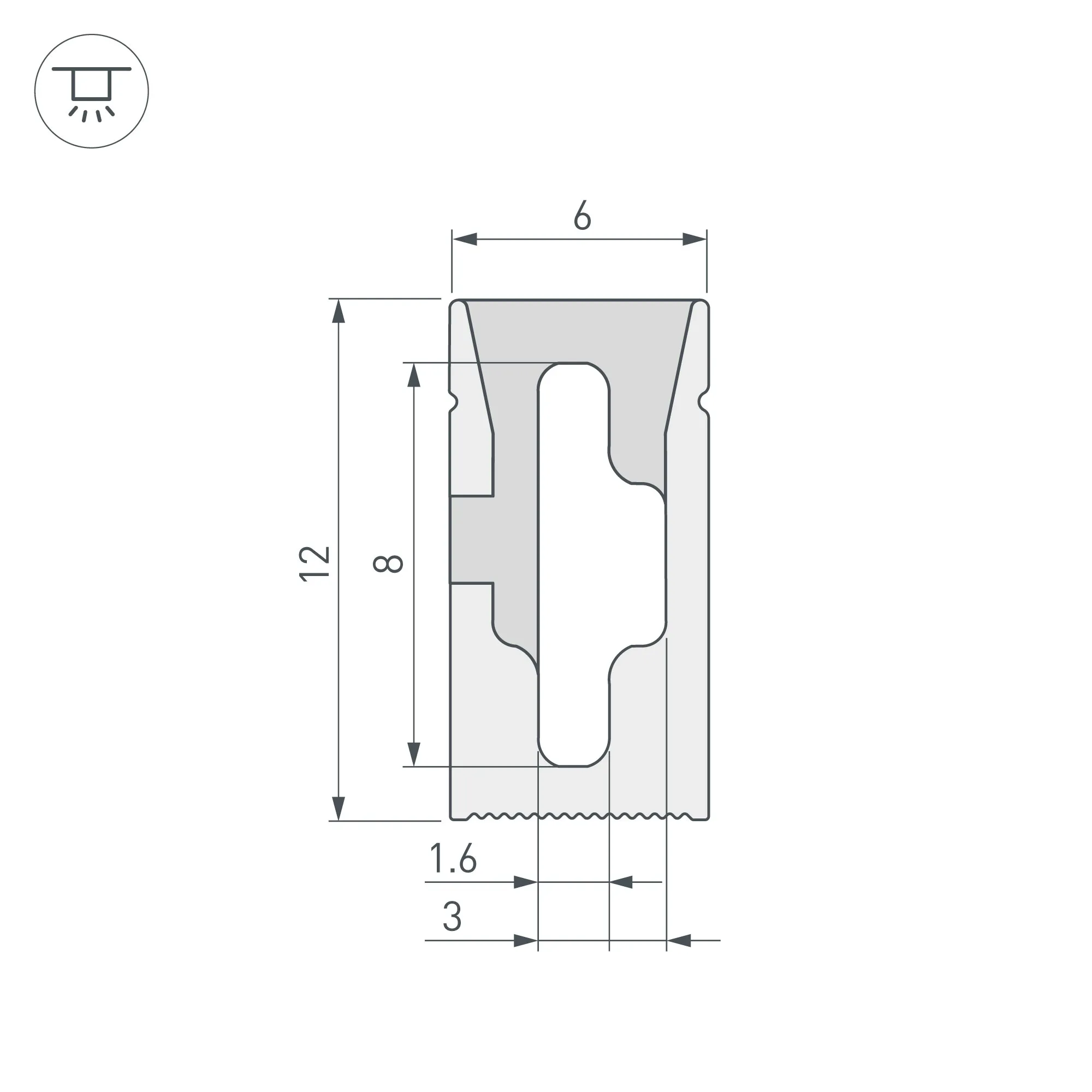 Цельнолитой силиконовый гибкий профиль, белый матовый. Габаритные размеры 10000×6×12 мм. Горизонтальный изгиб SIDE, минимальный радиус изгиба 30 мм. Для установки во влажных помещениях необходима герметизация при помощи двухкомпонентного эпоксидного герметика. Класс пылевлагозащиты – IP65 (при соблюдении технологии герметизации). Для лент шириной от 6 до 8 мм, высотой до 2,9 мм и мощностью до 10 Вт/м. При подборе ленты необходимо учитывать, что втяжка лент COB, герметичных лент и лент с наличием силиконового слоя может быть затруднена. Угол излучения 120°. Поставляется в катушках по 10 м. Цена за 1 м.