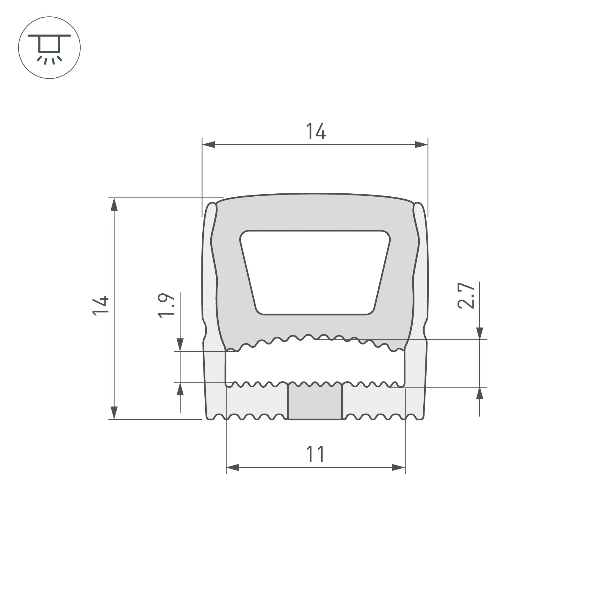 Цельнолитой силиконовый гибкий профиль, белый матовый с УФ защитой. Габаритные размеры 50000×14×14 мм. Вертикальный изгиб TOP, минимальный радиус изгиба 60 мм. Для установки во влажных помещениях необходима герметизация при помощи двухкомпонентного эпоксидного герметика. Класс пылевлагозащиты – IP65 (при соблюдении технологии герметизации). Для лент шириной от 10 до11 мм, высотой до 2,5 мм и мощностью до 10 Вт/м. При подборе ленты необходимо учитывать, что втяжка лент COB, герметичных лент и лент с наличием силиконового слоя может быть затруднена. Угол излучения 115°. Поставляется в катушках по 50 м. Цена за 1 м.