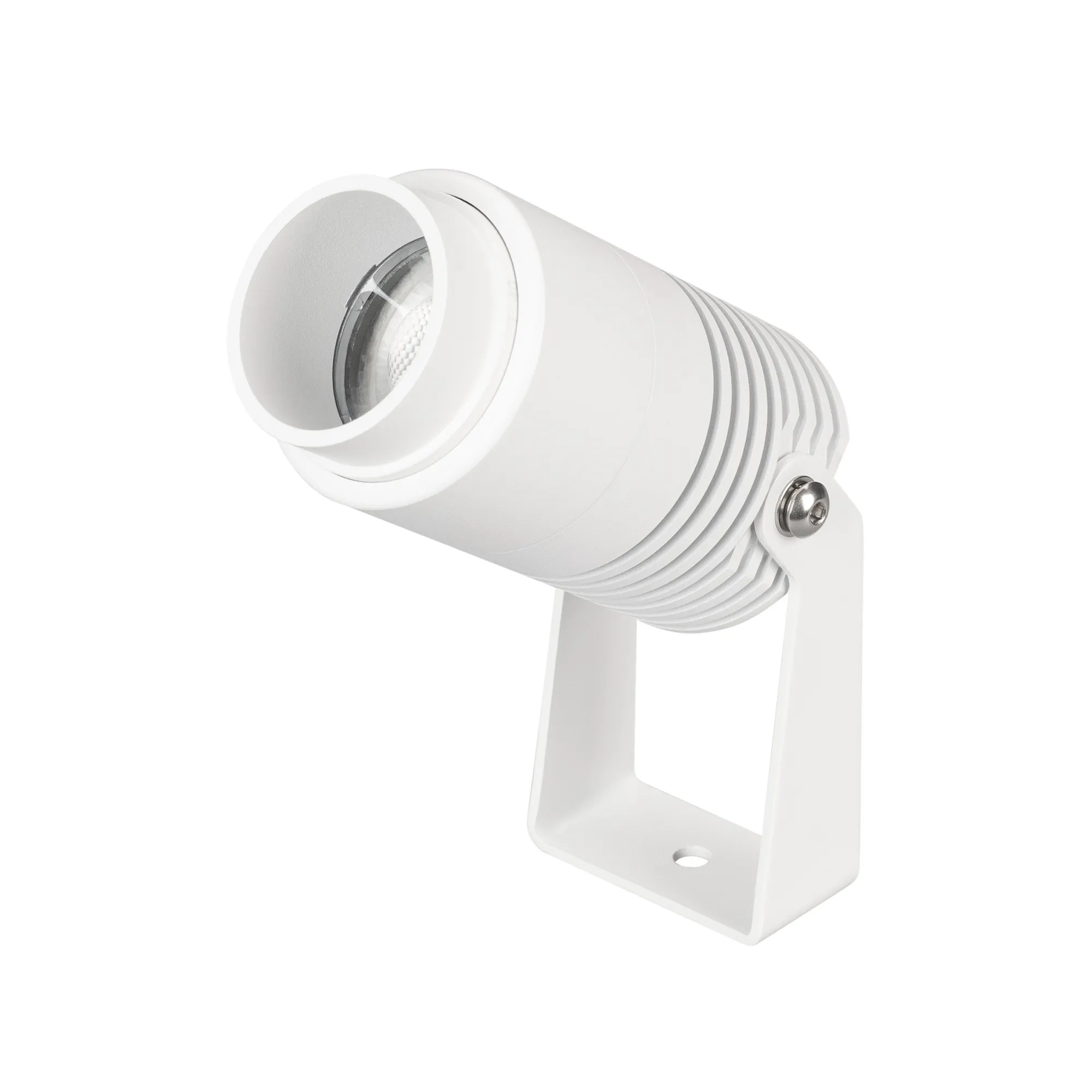 Уличный светодиодный прожектор, мощность 8Вт, регулируемый угол освещения 10-40°. Цвет ДНЕВНОЙ 4000К, световой поток для угла 10° 240 для угла 40° 420лм. Влагозащищенный корпус IP67 - белый алюминий, экран из закаленного стекла. Угол поворота корпуса в вертикальной плоскости 135°. Питание 230В, мощность 8 Вт. Размеры DxH - Ø52x103мм. В комплекте 1м провод.