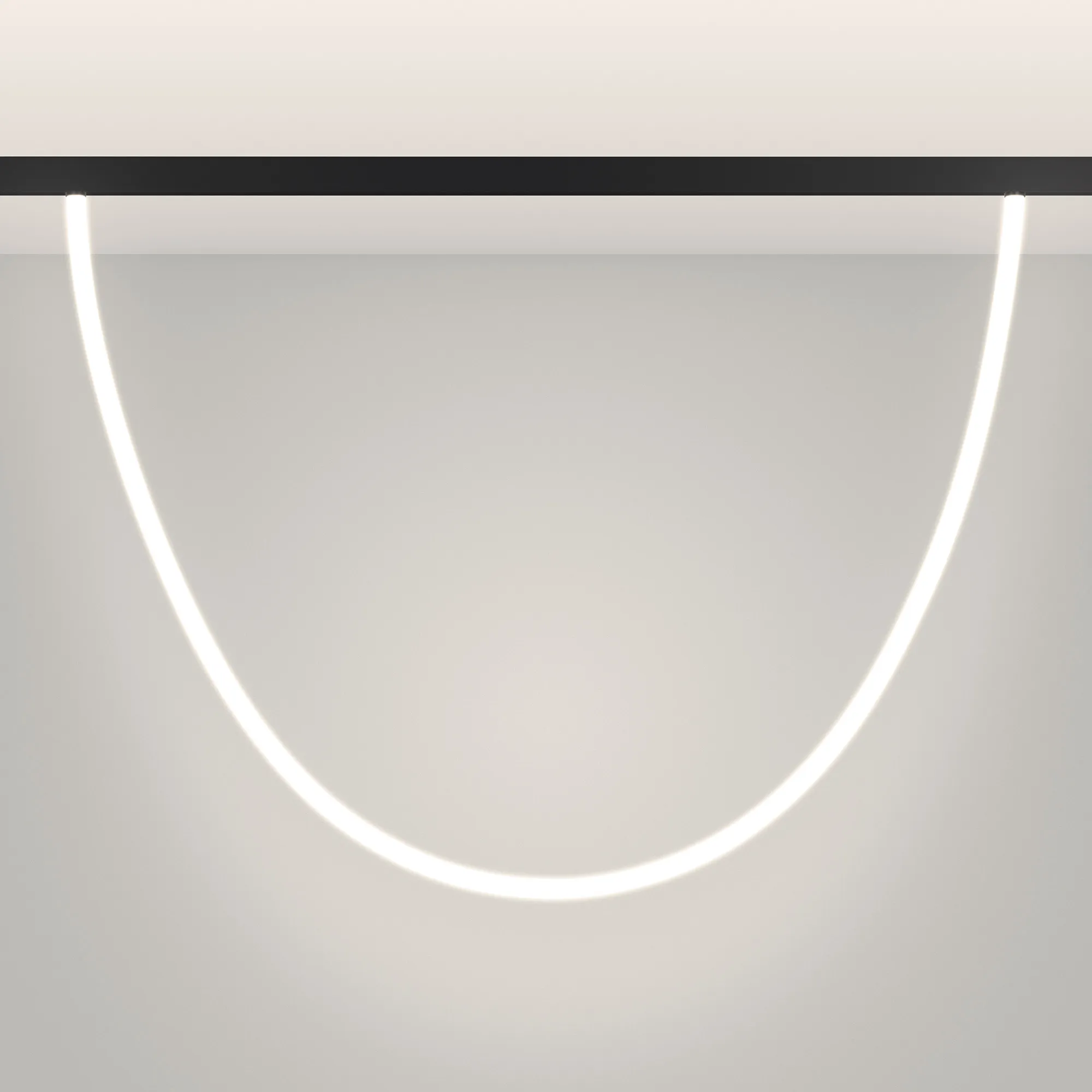 Светильник гибкий для магнитных треков серии ORIENT. Мощность 35 Вт, св. поток 2275 лм, 65 лм/Вт, дневной 4000 K, CRI>90, угол 360°, напряжение питания 48 В. Матовый белый фигурный корпус из силикона с черными креплениями. Размер: диаметр 25 мм, длина 2500 мм. Монтаж на магнитный трек ORIENT. Адаптеры в комплекте.
