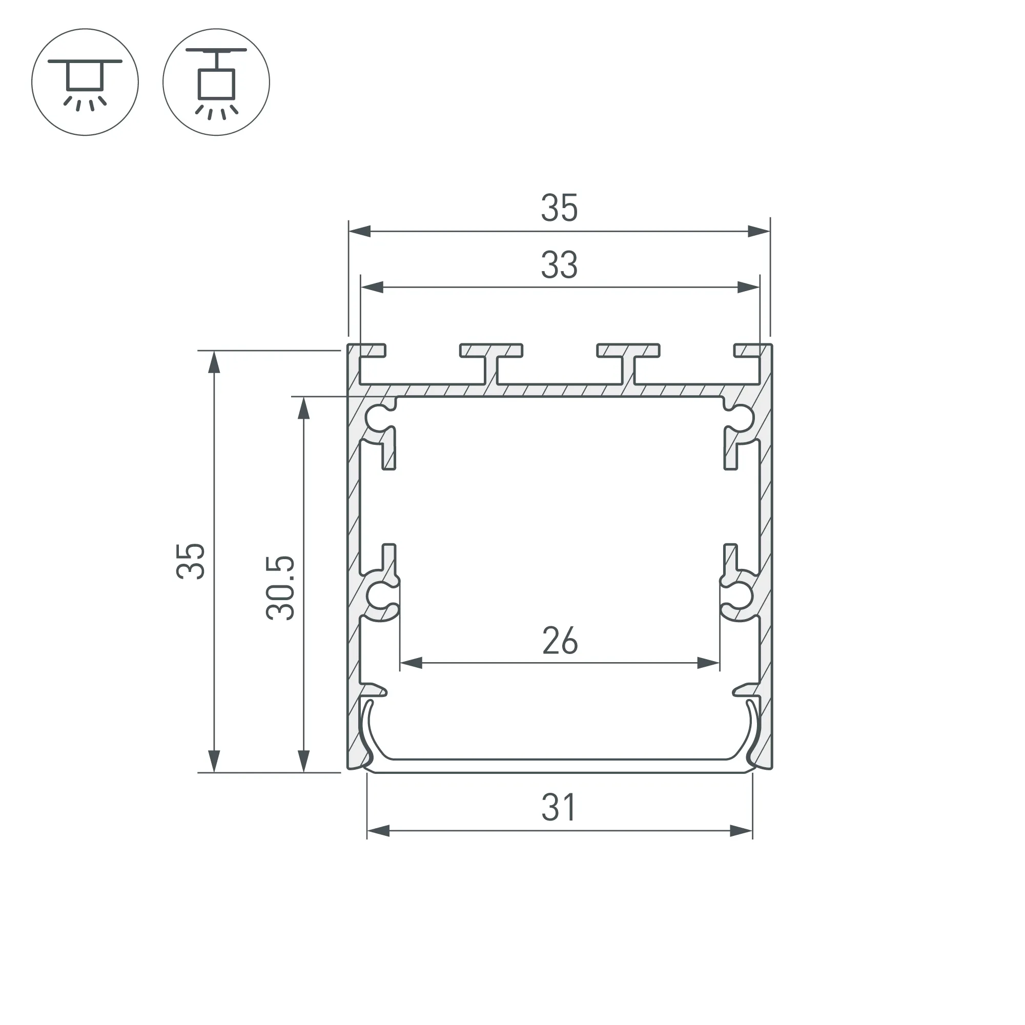 Алюминиевый профиль для светодиодных лент и линеек. Цвет - белый (порошковая окраска RAL9003). Габаритные размеры (L×W×H): 2500x35x35,5 мм. Ширина площадки для ленты 26 мм. Экраны, заглушки и другие аксессуары приобретаются отдельно. Цена за 1 метр.