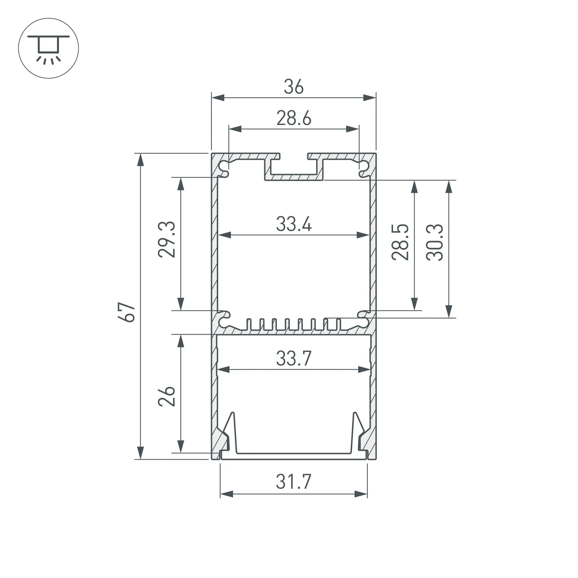 Алюминиевый профиль для светодиодных лент и линеек. Цвет - черный RAL9005 (порошковая окраска). Габаритные размеры (L×W×H): 2000x35x67 мм. Ширина площадки для ленты 33 мм. Отсек для БП 32х29мм. Экраны, заглушки и другие аксессуары приобретаются отдельно. Цена за 1 метр.