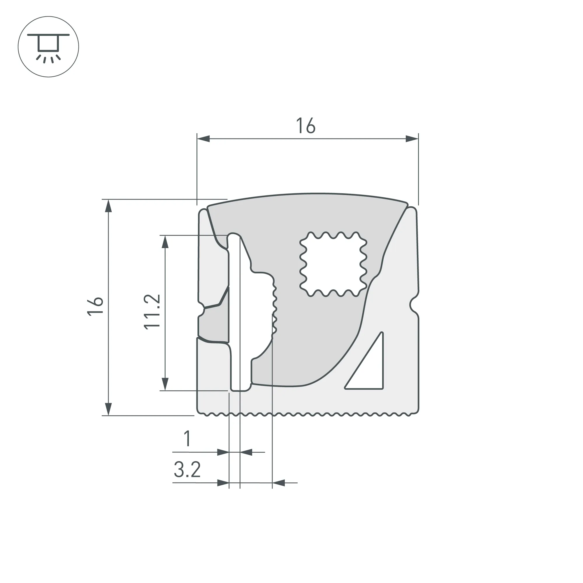 Цельнолитой силиконовый гибкий профиль, белый матовый. Габаритные размеры 5000×16×16 мм. Горизонтальный изгиб SIDE, минимальный радиус изгиба 30 мм. Для установки во влажных помещениях необходима герметизация при помощи двухкомпонентного эпоксидного герметика. Класс пылевлагозащиты – IP65 (при соблюдении технологии герметизации). Для лент шириной от 8 до11 мм, высотой до 3,3 мм и мощностью до 10 Вт/м. При подборе ленты необходимо учитывать, что втяжка лент COB, герметичных лент и лент с наличием силиконового слоя может быть затруднена. Угол излучения 110°. Поставляется в катушках по 5 м. Цена за 1 м.