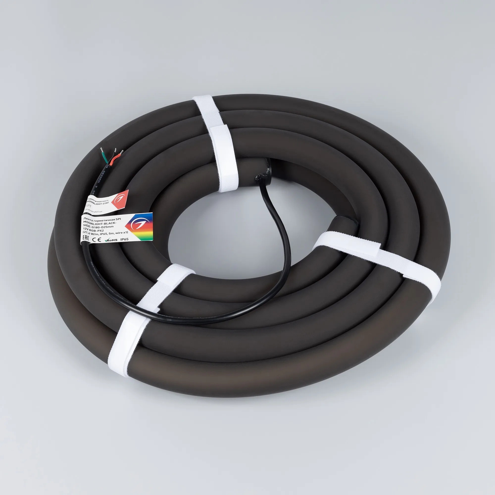 В магазине Arled Market Вы можете купить "Лента светодиодная герметичная SPI MOONLIGHT-BLACK-SIDE-G180-D25mm 12V RGB-PX2 (21.6 W/m, IP65, 5m, wire x1) (Arlight, Вывод боковой, 3 года)"