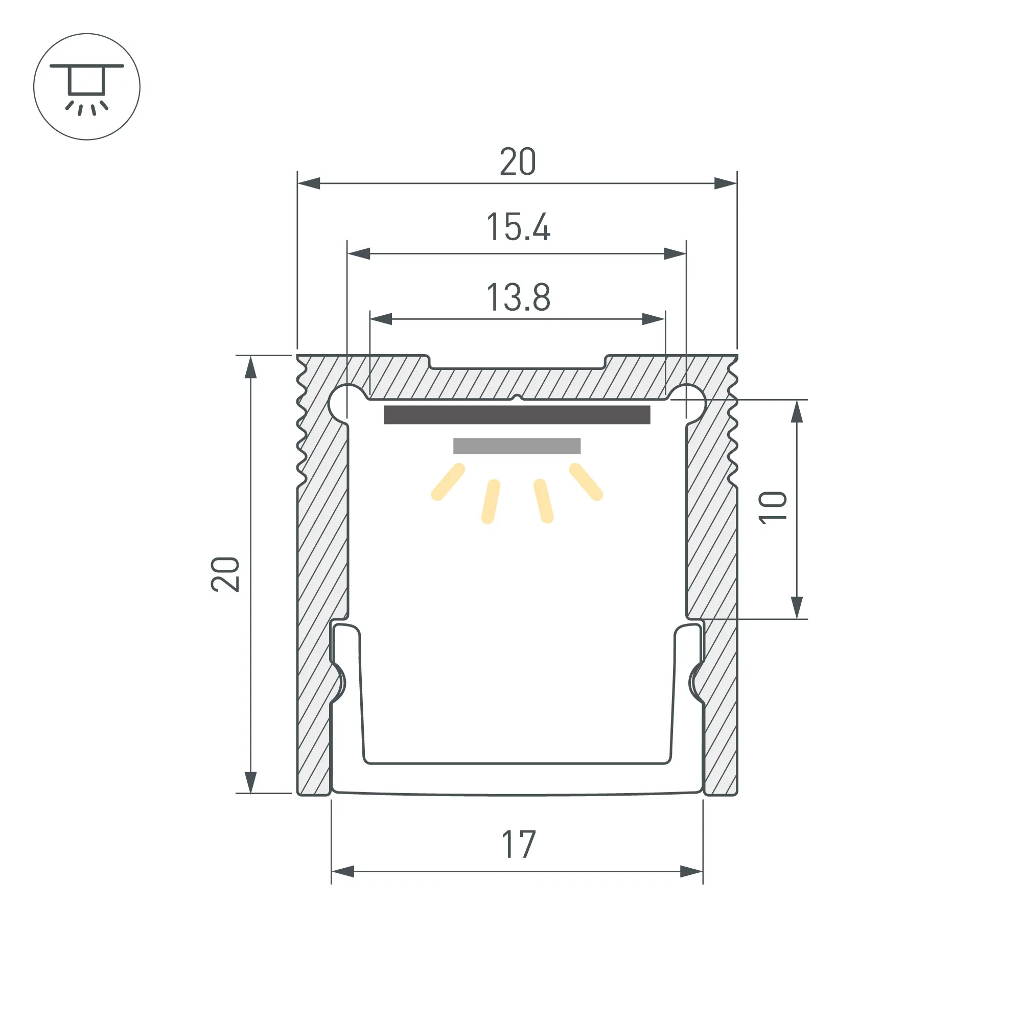 Алюминиевый профиль для светодиодных лент и линеек. Цвет - черный RAL9005 (порошковая окраска). Габаритные размеры (L×W×H): 2000x20x20 мм. Ширина площадки для ленты 15 мм. Экраны, заглушки и другие аксессуары приобретаются отдельно. Цена за 1 метр.