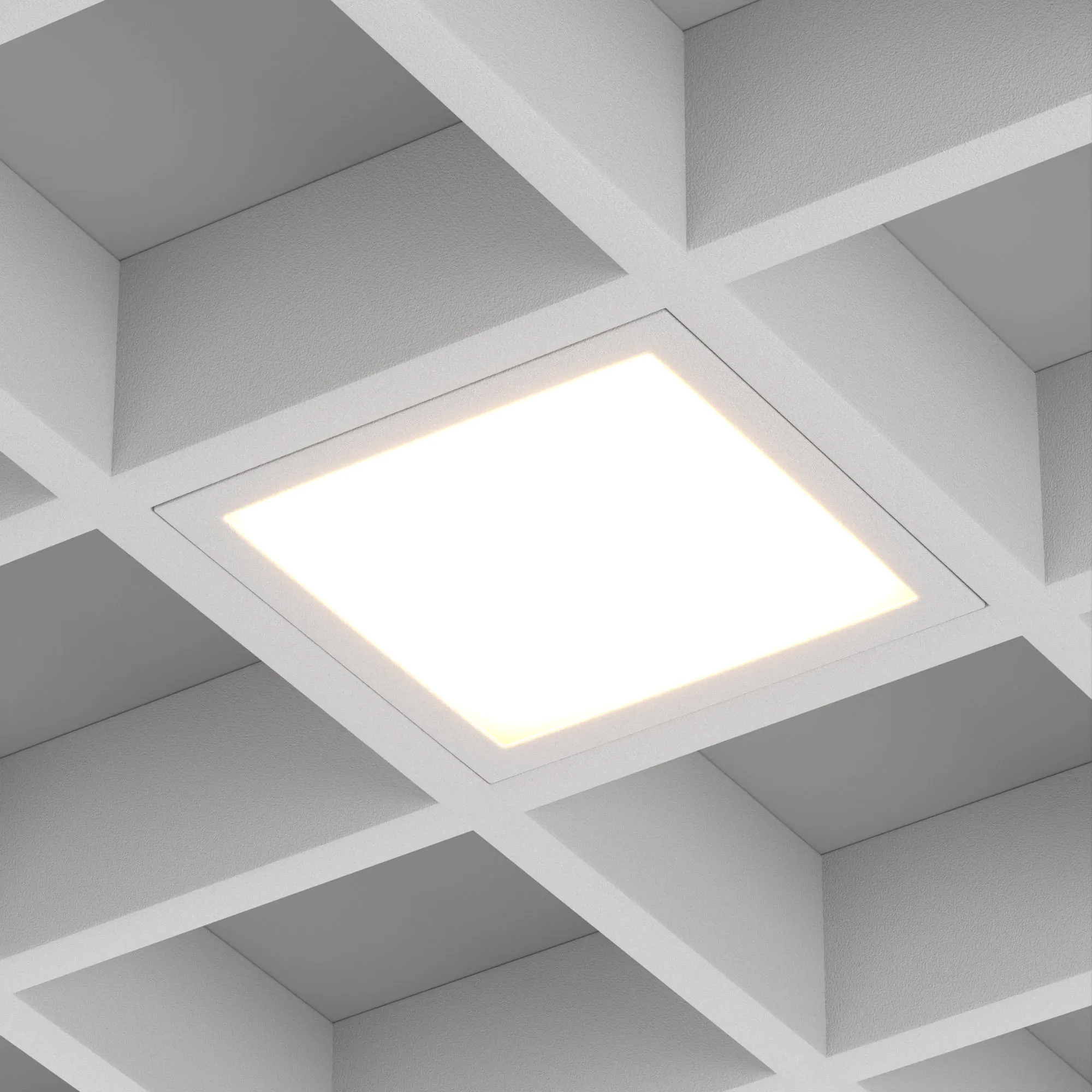 Встраиваемый светильник даунлайт для установки в потолки Грильято с размером ячейки 150х150 мм и высотой направляющих 30, 40 или 50 мм. Мощность 18 Вт, св. поток 1491 лм, 85 лм/Вт, тёплый 3000 K, CRI>90, угол 100°, напряжение питания 230 В. Серый квадратный корпус из алюминия (RAL7045), степень защиты IP40. Размер: длина 140 мм, ширина 140 мм, высота 40 мм. Монтаж встраиваемый, установочное отверстие: длина 140 мм, ширина 140 мм. Драйвер 24-42 В, 450 мА, пульсация <1%.