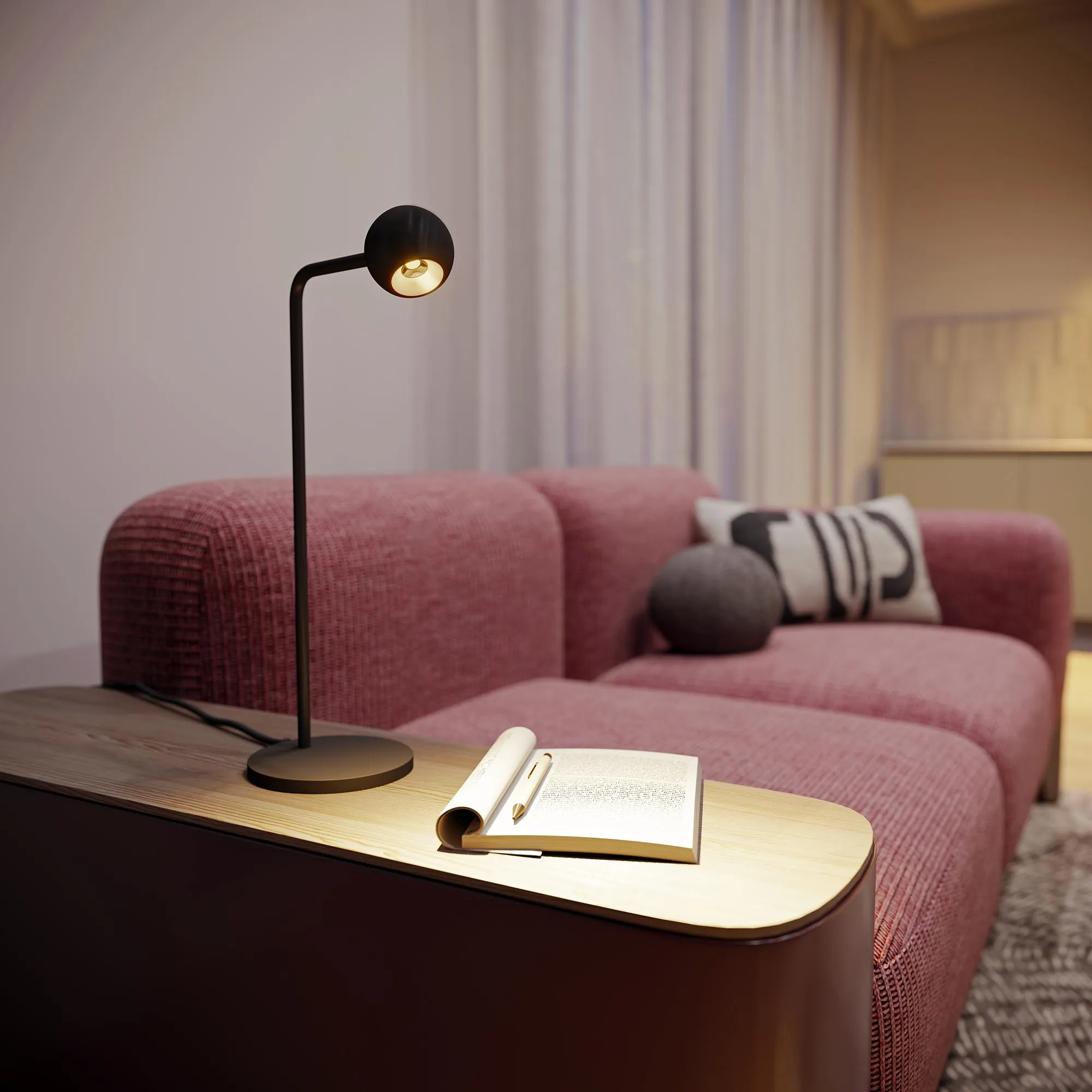 Декоративный настольный светильник. Мощность 6 Вт, св. поток 540 лм, 90 лм/Вт, теплый 3000К, CRI>90, угол 30°, напряжение питания 230 В. Черный корпус из алюминия (основание, ножка, светоизлучаль в форме шара), степень защиты IP20. Размер основания Ø140×11 мм, размер ножки Ø12,5×430х120 мм, размер светоизлучателя Ø65×55,5 мм. Длина провода 1580 мм, питание от сети 220-240V., пульсация <1%