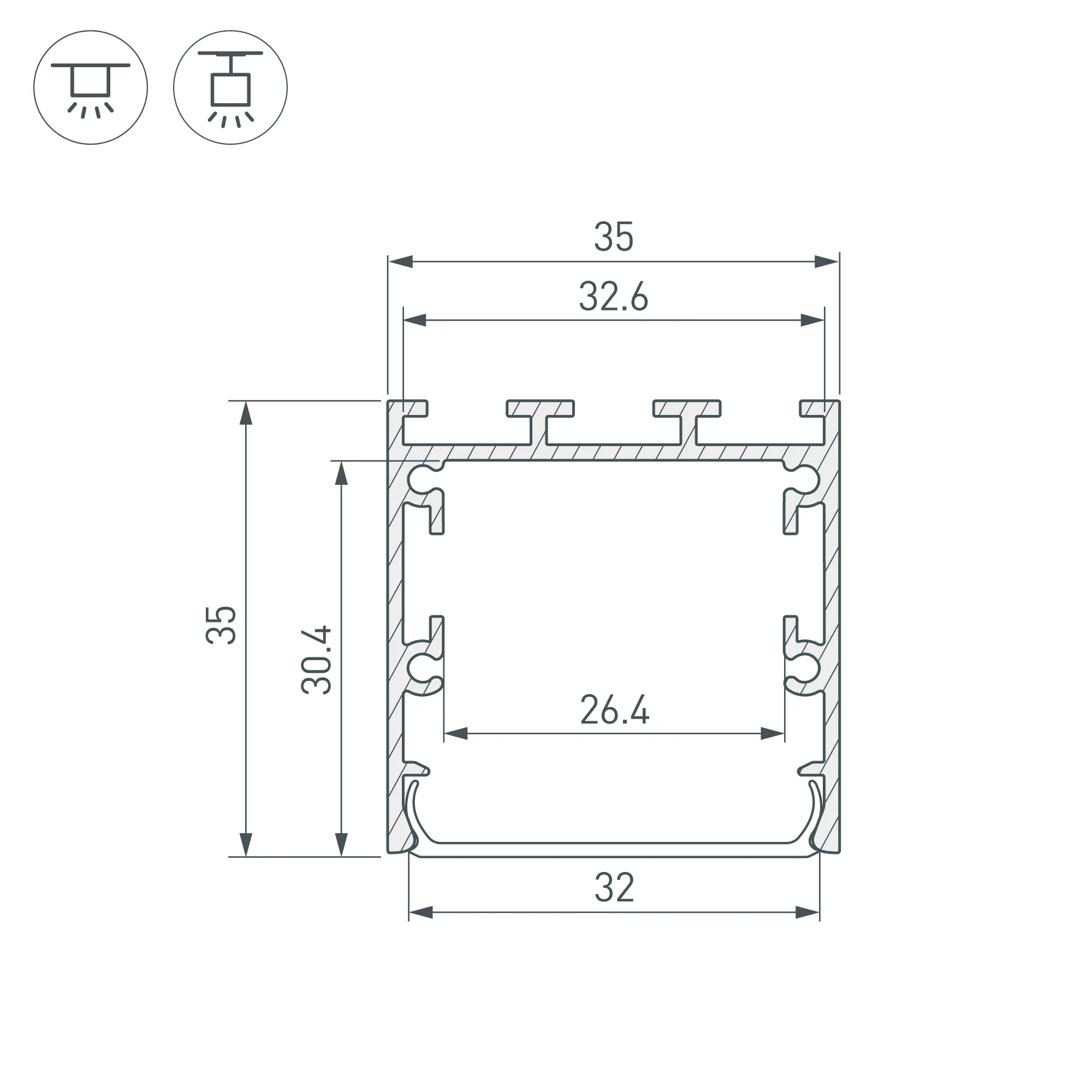 Алюминиевый профиль для светодиодных лент и линеек. Цвет - черный RAL9005 (порошковая окраска). Габаритные размеры (L×W×H): 2500x35x35 мм. Ширина площадки для ленты 26,4 мм. Экраны, заглушки и другие аксессуары приобретаются отдельно. Цена за 1 метр.