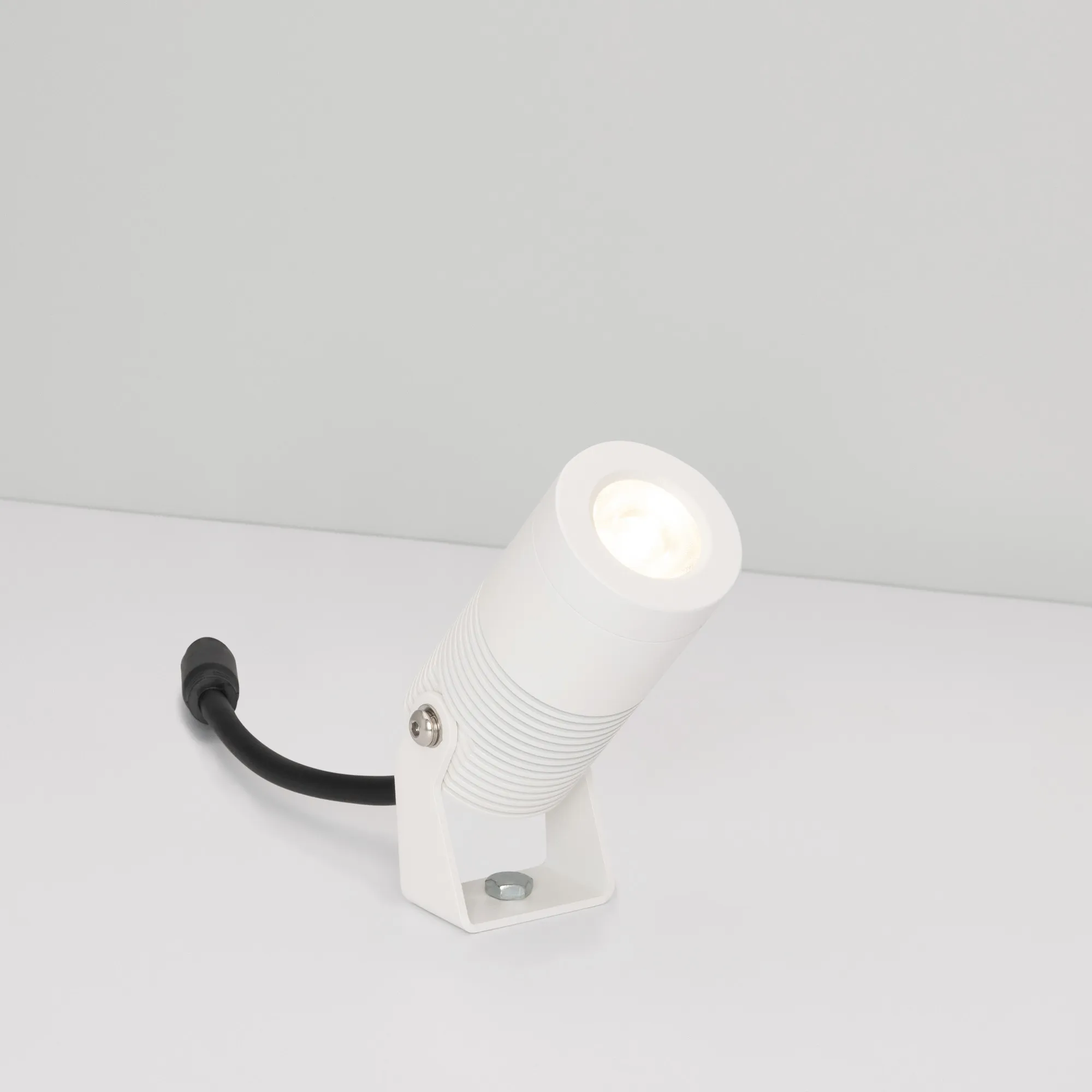 Уличный светодиодный прожектор, мощность 8Вт, угол освещения 33°. Цвет ДНЕВНОЙ 4000К, световой поток 610лм. Влагозащищенный корпус IP67 - белый алюминий, экран из закалённого стекла. Угол поворота корпуса в вертикальной плоскости 135°. Питание 230В, мощность 8 Вт. Размеры DxH -Ø44х90мм. В комплекте 1м провод.