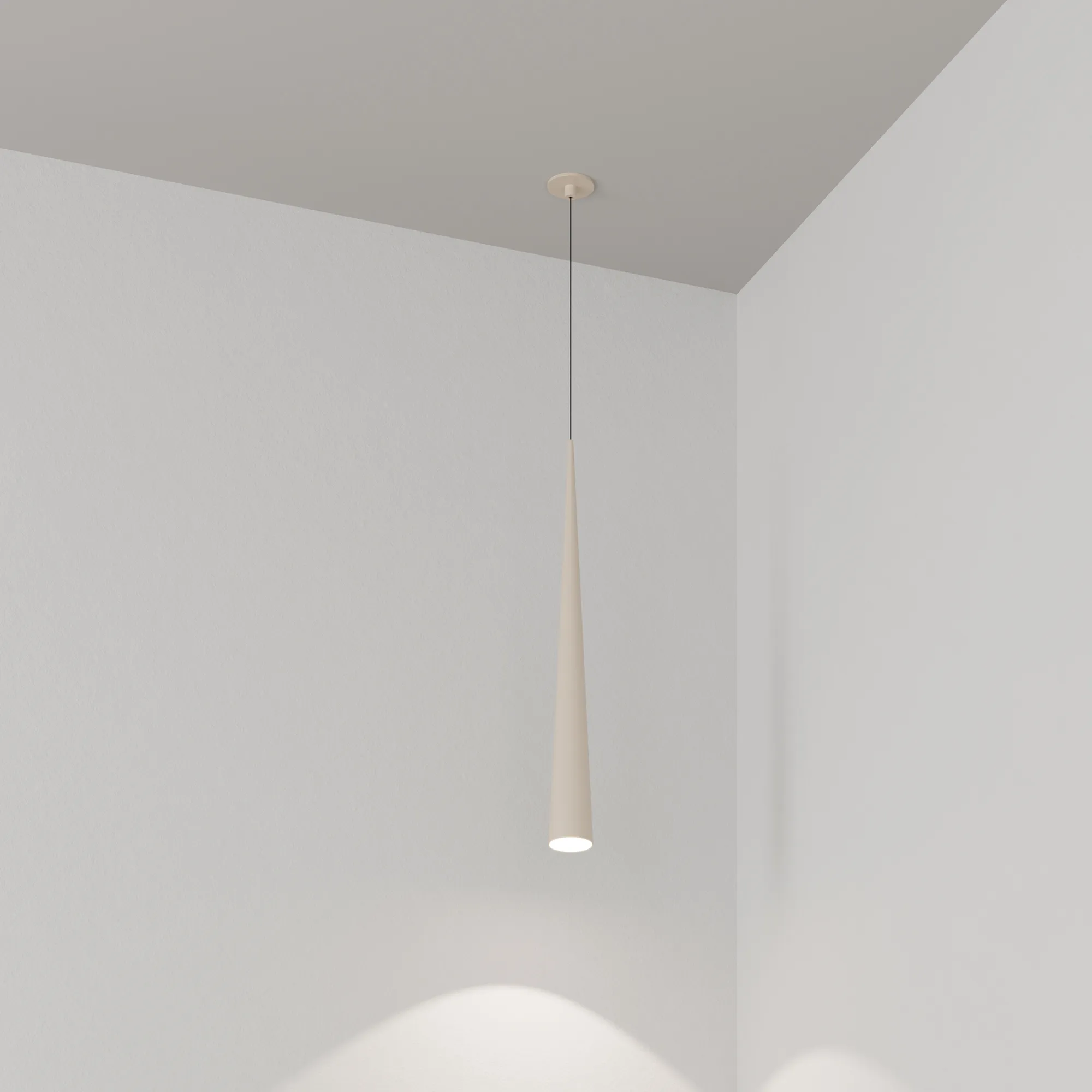 Подвесной светильник. Мощность 5 Вт, св. поток 400 лм, 70 лм/Вт, теплый 3000K, CRI>92, угол 36°, напряжение питания 230 В. Кремовый конусообразный вытянутый корпус из алюминия, линза из PMMA, степень защиты IP20. Размер: диаметр 76 мм, высота 670 мм. Монтаж подвесной, длина подвеса 2000 мм, регулируемая. В комплекте 2 вида чаш. Габариты встраиваемой чаши: Ø 80x41 мм. Габариты накладной чаши Ø80x60 мм. Драйвер 2,8-12В, 500 мА, пульсация <1%.