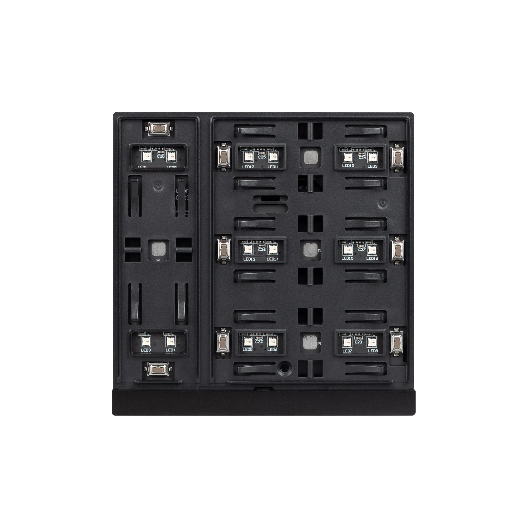Механизм универсальной многофункциональной встраиваемой настенной панели для систем KNX. 4 клавиши, светодиодная индикация. Наличие функции KNX Secure. Безрамочный корпус черного цвета, материал - пластик, светодиодная индикация (настраиваемая RGB палитра индикации). В механизме панели предусмотрено 2 дополнительных бинарных входа для подключения датчиков температуры NTC или выключателей. Питание от шины KNX DC 21-30V. Габариты 86x86x33 мм.