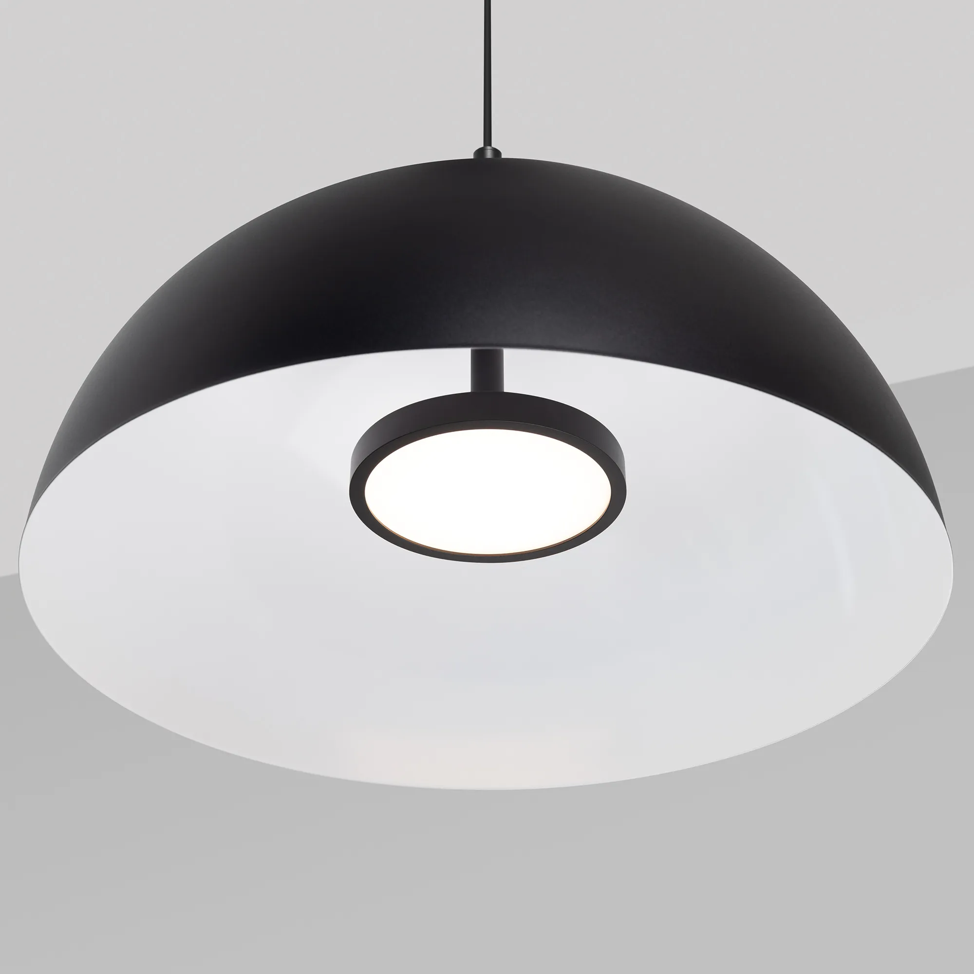 Подвесной светодиодный светильник SP-ALUME. Мощность 20 Вт, световой поток поток 1200 Лм, цветовая температура MIX 2700К-3000К-4000K, CRI>90, угол 120°, напряжение питания 230 В. Черный круглый корпус из стали, степень защиты IP33. Размер плафона: диаметр 500 мм, высота 250 мм. Монтаж подвесной, длина подвеса 1500 мм. В комплекте блок питания, пульт, токопроводящий подвес, чаша. Гарантия 3 года. Поставка в сборке.