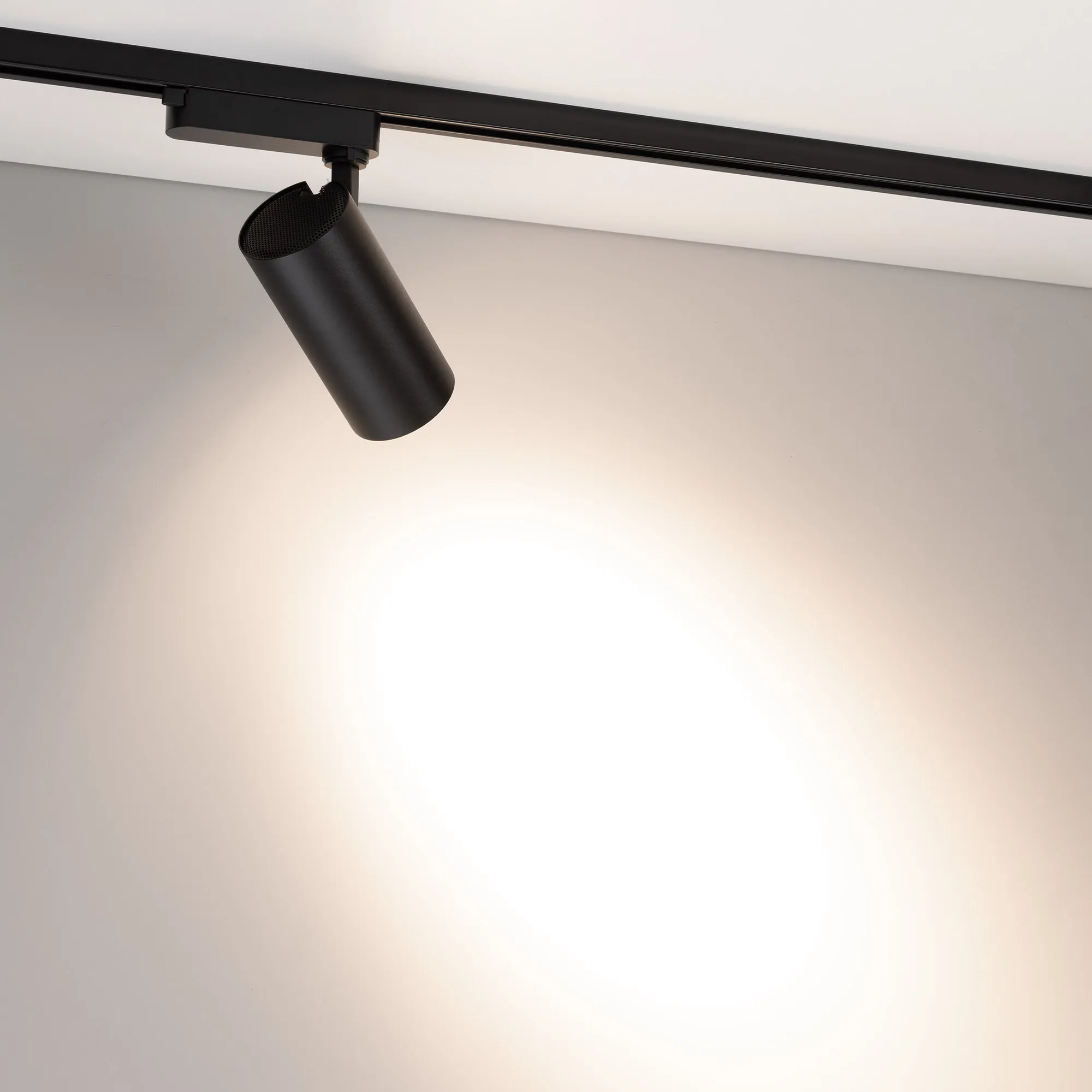 Светильник для треков/шин 2 провода. Мощность 20 Вт, св. поток без решетки honeycomb 2000 лм, 100 лм/Вт, с решеткой honeycomb 1320 лм, 66 лм/Вт, дневной 4000 K, CRI>90, угол 24°, напряжение питания 230 В. Черный круглый корпус из алюминия, материал линзы PMMA, степень защиты IP20. Размер: диаметр 74 мм, длина световой части 154 мм. Монтаж на трек 1-фазный. Драйвер встроенный 500 мА 25-40 В, пульсация <5%.