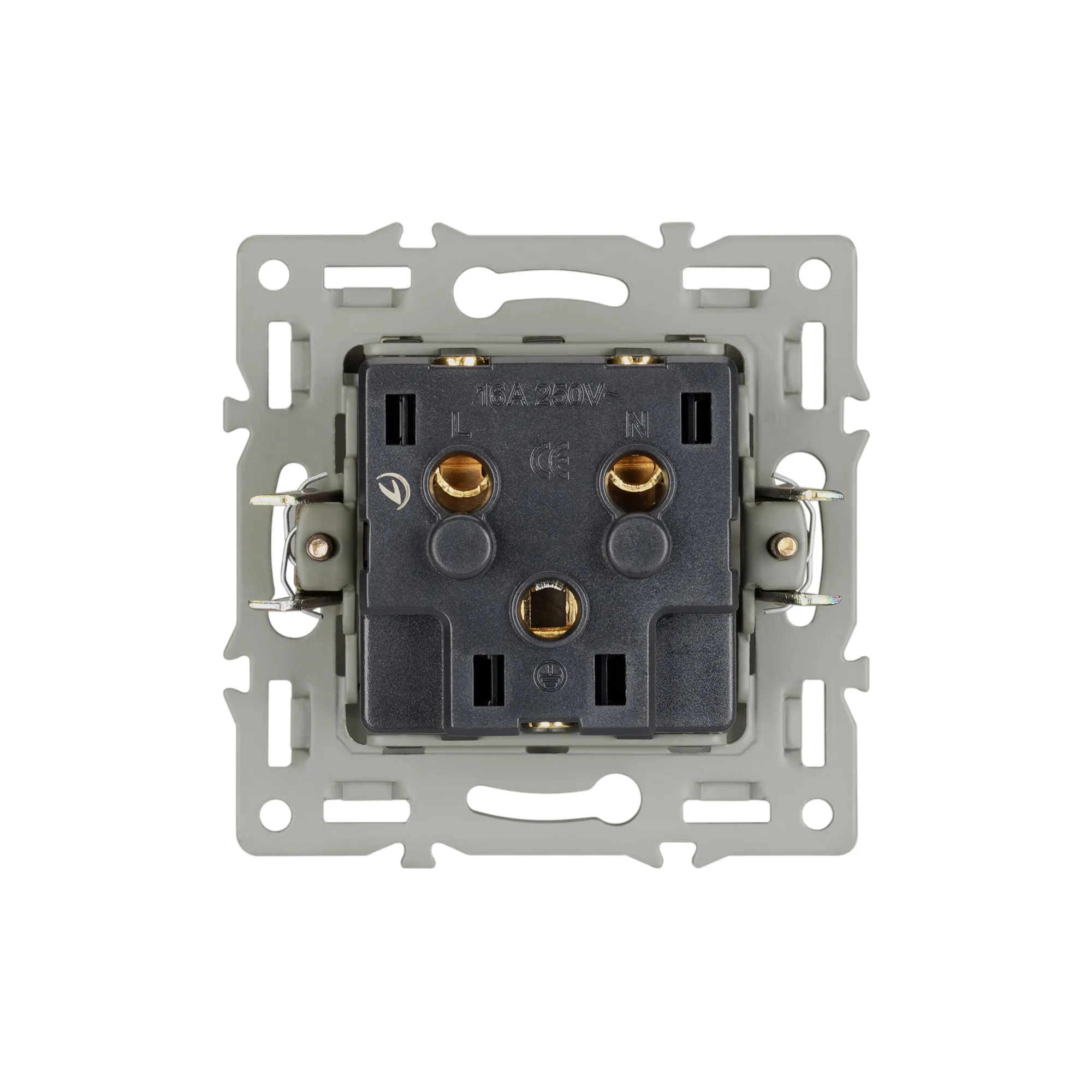 Механизм розетки с заземлением на 1 пост, с суппортом из алюминия. Цвет - черный. Степень пылевлагозащиты - IP20.