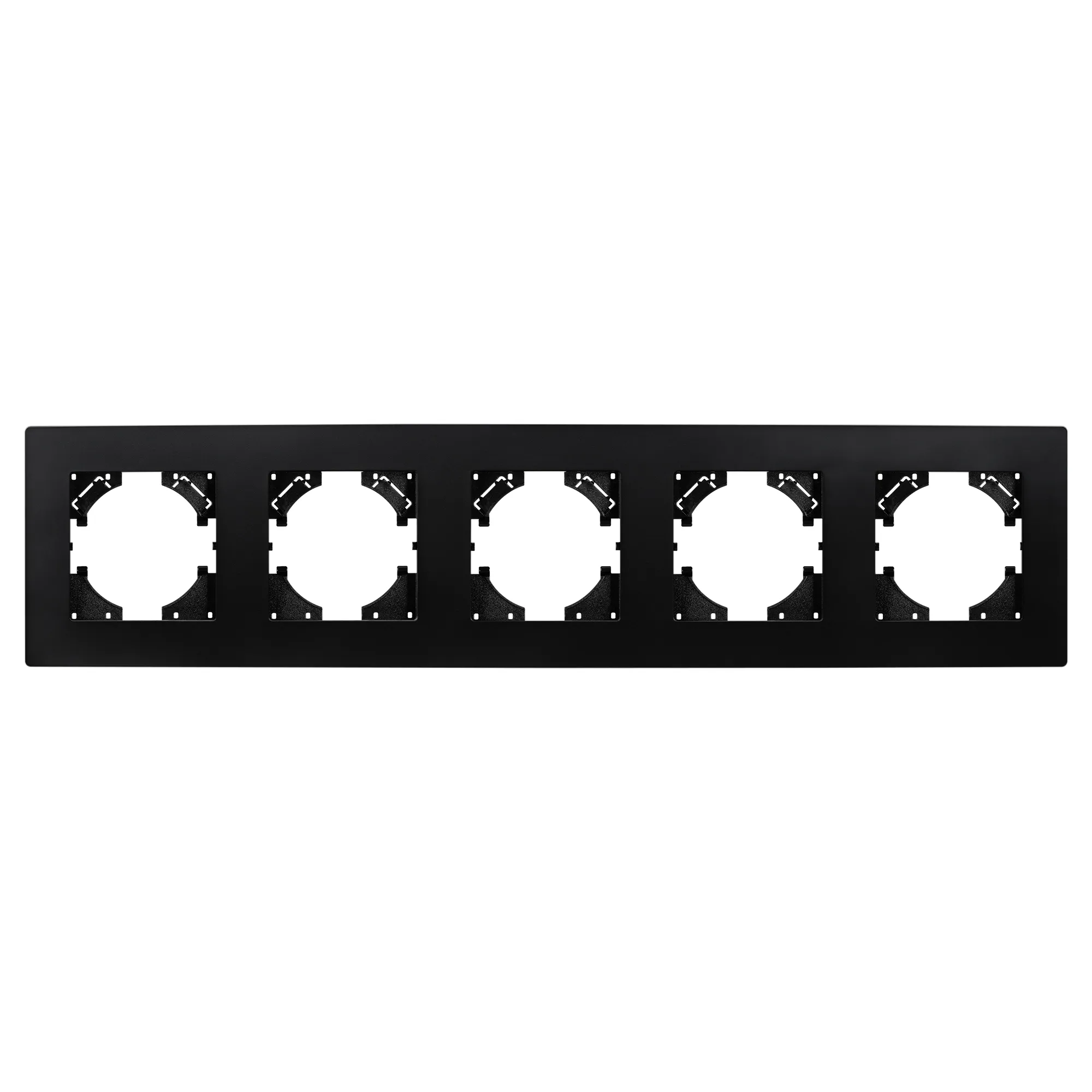 Рамка пластиковая на 5 постов, под встраиваемый механизм. Цвет - черный. Уровень герметичности IP20. Ориентация монтажа - горизонтальная (основным ориентиром служат посадочные выступы для накладки механизма).