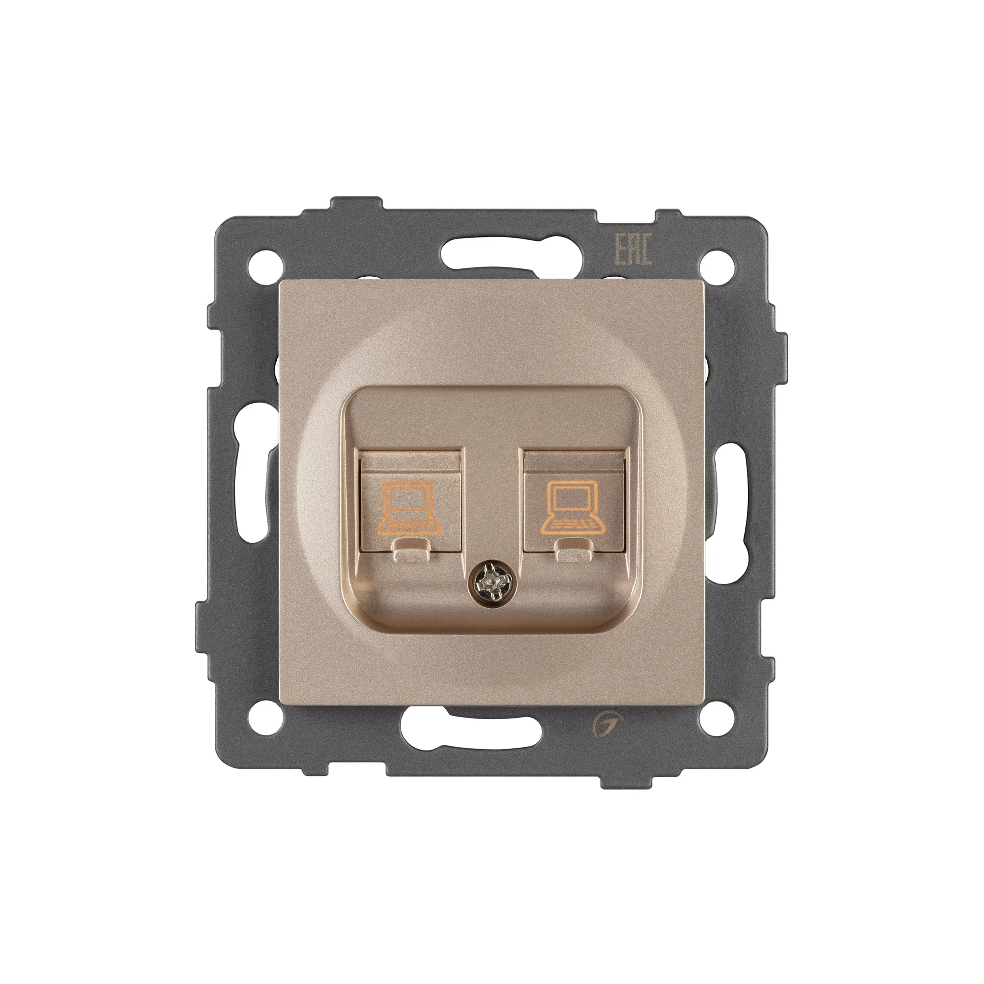 Механизм компьютерной розетки на 2 поста 6-й категории. Цвет - золотой. Без фронтальной рамки. Уровень пылевлагозащиты IP20. Тип подключаемого разъема - RJ45. Розетка устанавливается в стандартный круглый подрозетник.
