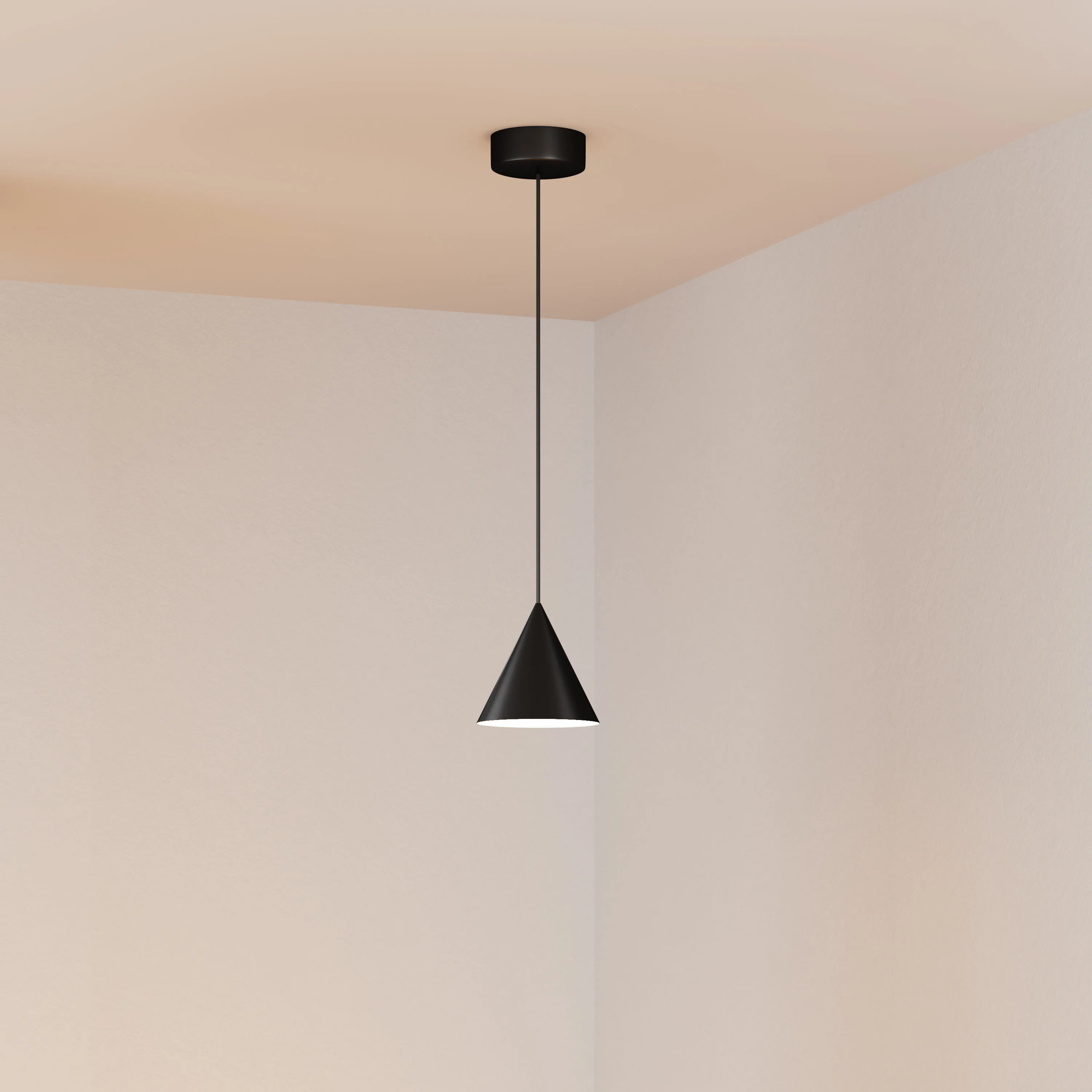 Подвесной светильник. Мощность 10 Вт, св. поток 650 лм, 65 лм/Вт, теплый 3000 K, CRI>94, угол 36°, напряжение питания 230 В. Черный корпус из алюминия в форме конуса с белой внутренней поверхностью, линза-рассеиватель из PMMA, степень защиты IP20. Размер: диаметр 180 мм, высота 175 мм. Монтаж подвесной, длина подвеса 2000 мм, регулируемая. В комплекте две чаши. Габариты чаши (встроенной) Ø80 х 41 мм, врезное отверстие Ø55 мм, габариты чаши (накладной) Ø110 х 25 мм. Драйвер 2,8-12В, 500 мА, пульсация <1%. Управление по TRIAC.