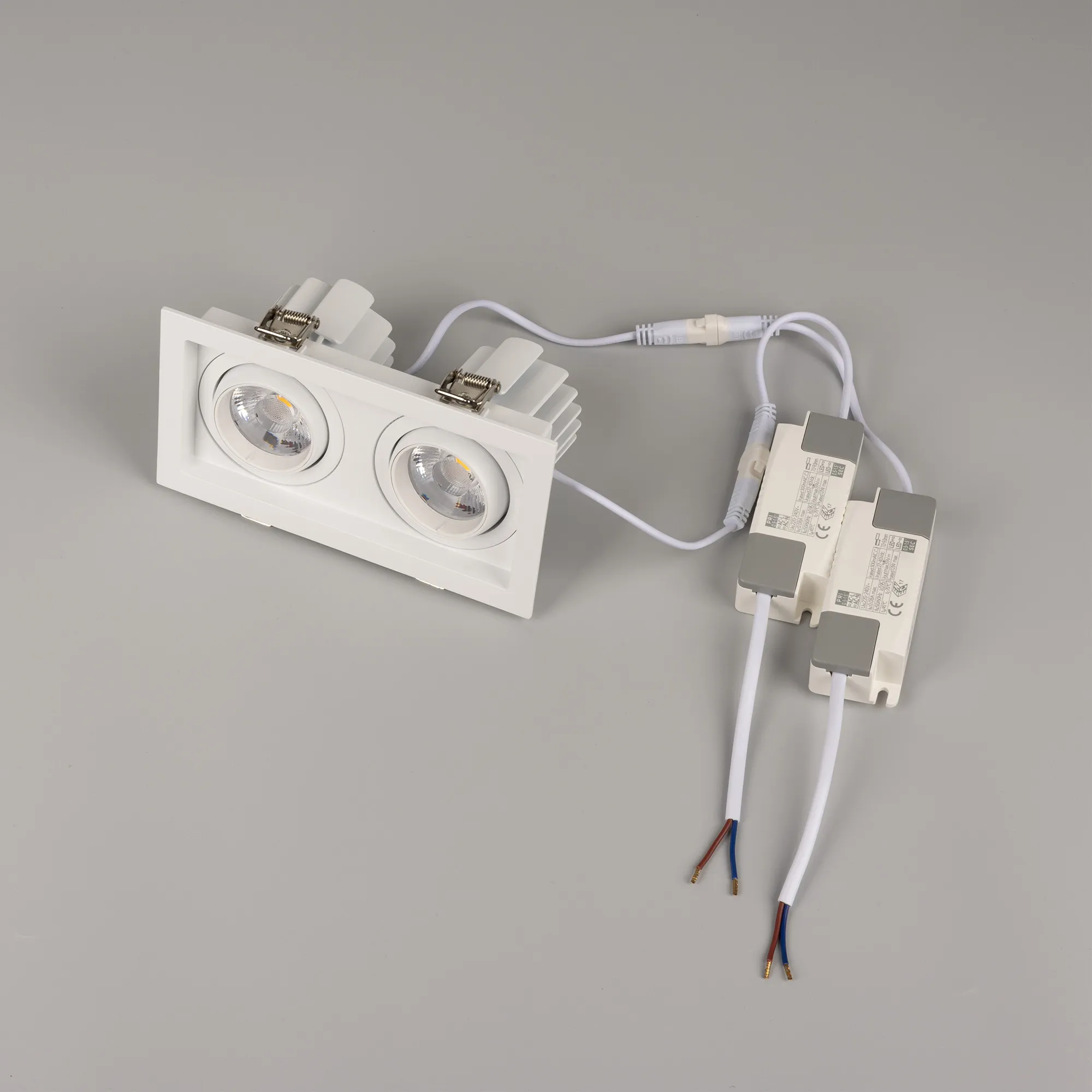 Встраиваемый карданный светильник. Мощность 2х12 Вт, св. поток 2636 лм, 109 лм/Вт, тёплый 3000 K, CRI>92, угол 20°, напряжение питания 230 В. Белый корпус из алюминия, белая вставка, степень защиты IP20. Размер: длина 170 мм, ширина 90 мм, высота 80 мм. Монтаж встраиваемый, установочное отверстие: длина 155 мм, ширина 75 мм. Драйвер 27-40 В, 300 мА, пульсация <2%.