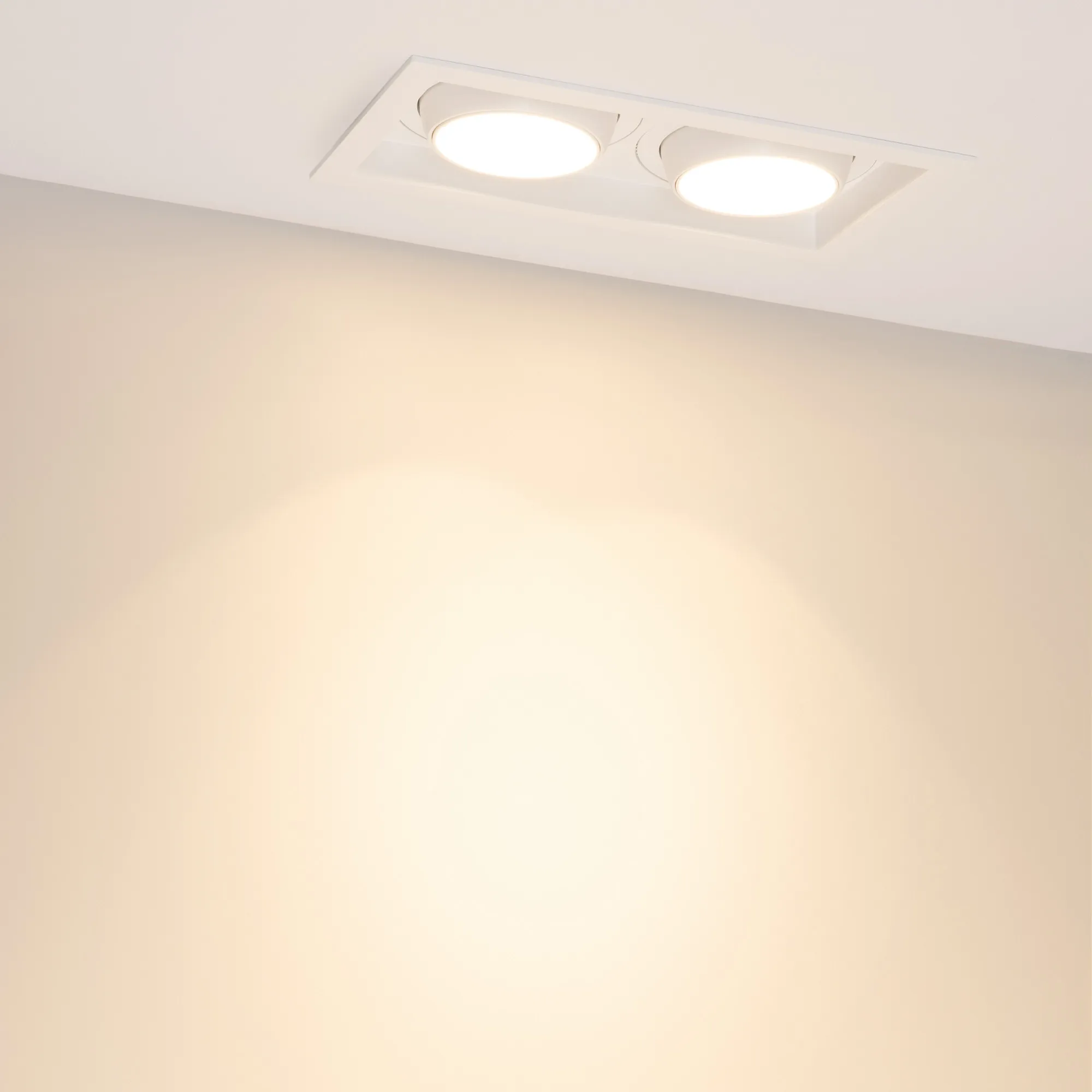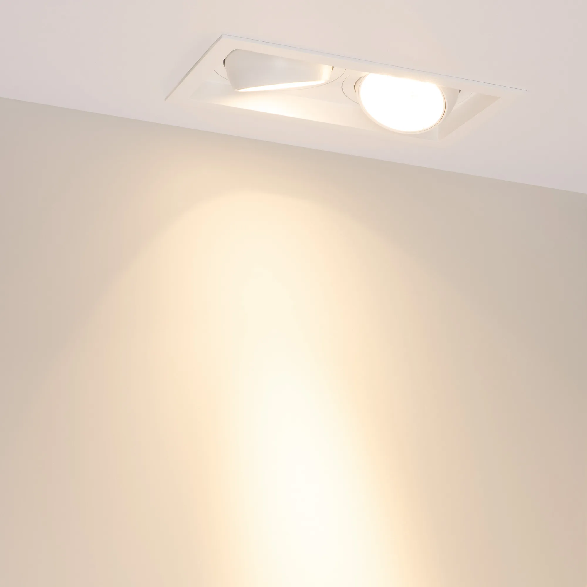 Встраиваемый карданный светильник. Мощность 2х30 Вт, св. поток 6208 лм, 103 лм/Вт, тёплый 3000 K, CRI>92, угол 17°, напряжение питания 230 В. Белый корпус из алюминия, белая вставка, степень защиты IP20. Размер: длина 250 мм, ширина 140 мм, высота 125 мм. Монтаж встраиваемый, установочное отверстие: длина 230 мм, ширина 120 мм. Драйвер 24-42 В, 750 мА, пульсация <2%.