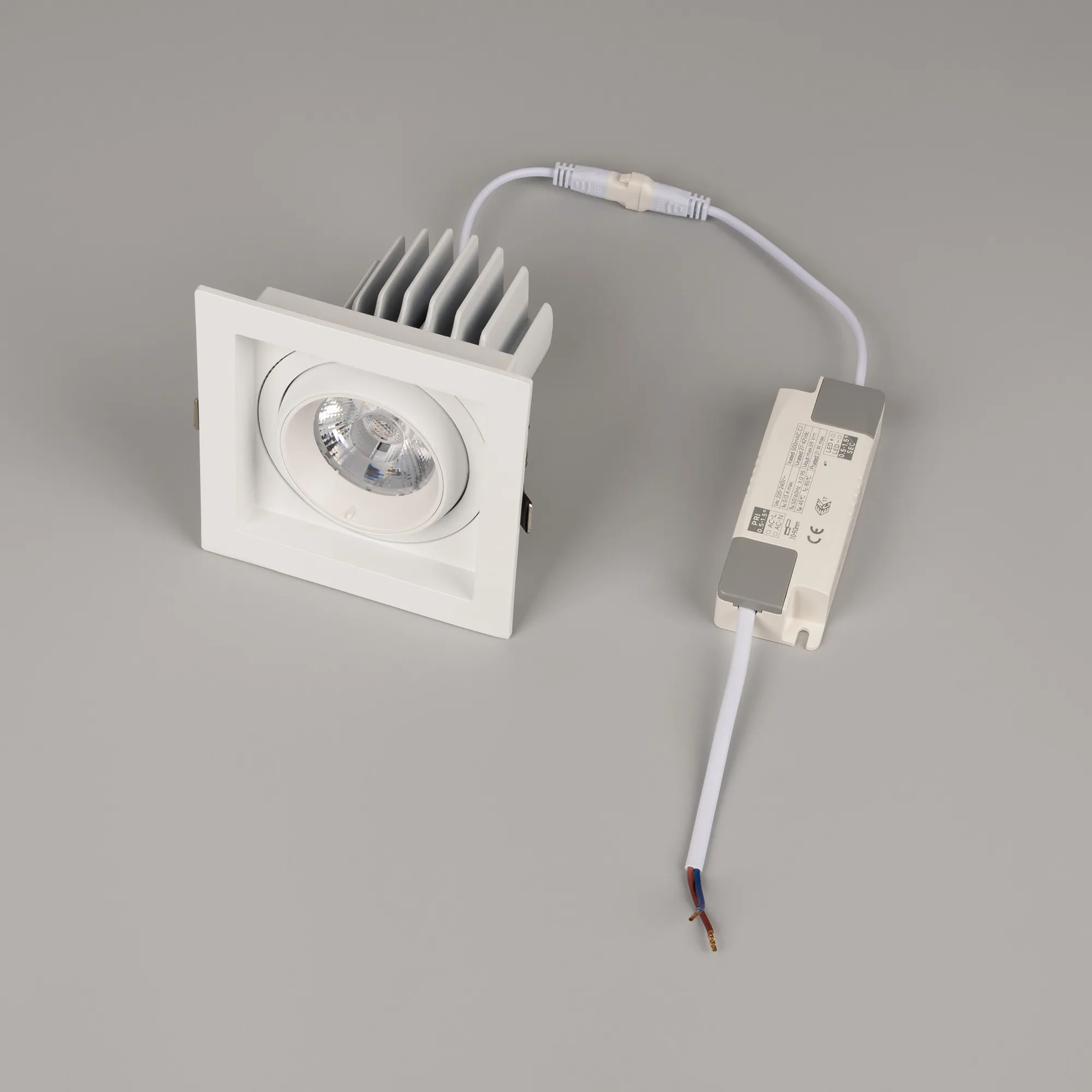 Встраиваемый карданный светильник. Мощность 20 Вт, св. поток 2067 лм, 103 лм/Вт, дневной 4000 K, CRI>92, угол 20°, напряжение питания 230 В. Белый корпус из алюминия, белая вставка, степень защиты IP20. Размер: длина 117 мм, ширина 117 мм, высота 105 мм. Монтаж встраиваемый, установочное отверстие: длина 95 мм, ширина 95 мм. Драйвер 24-42 В, 500 мА, пульсация <2%.