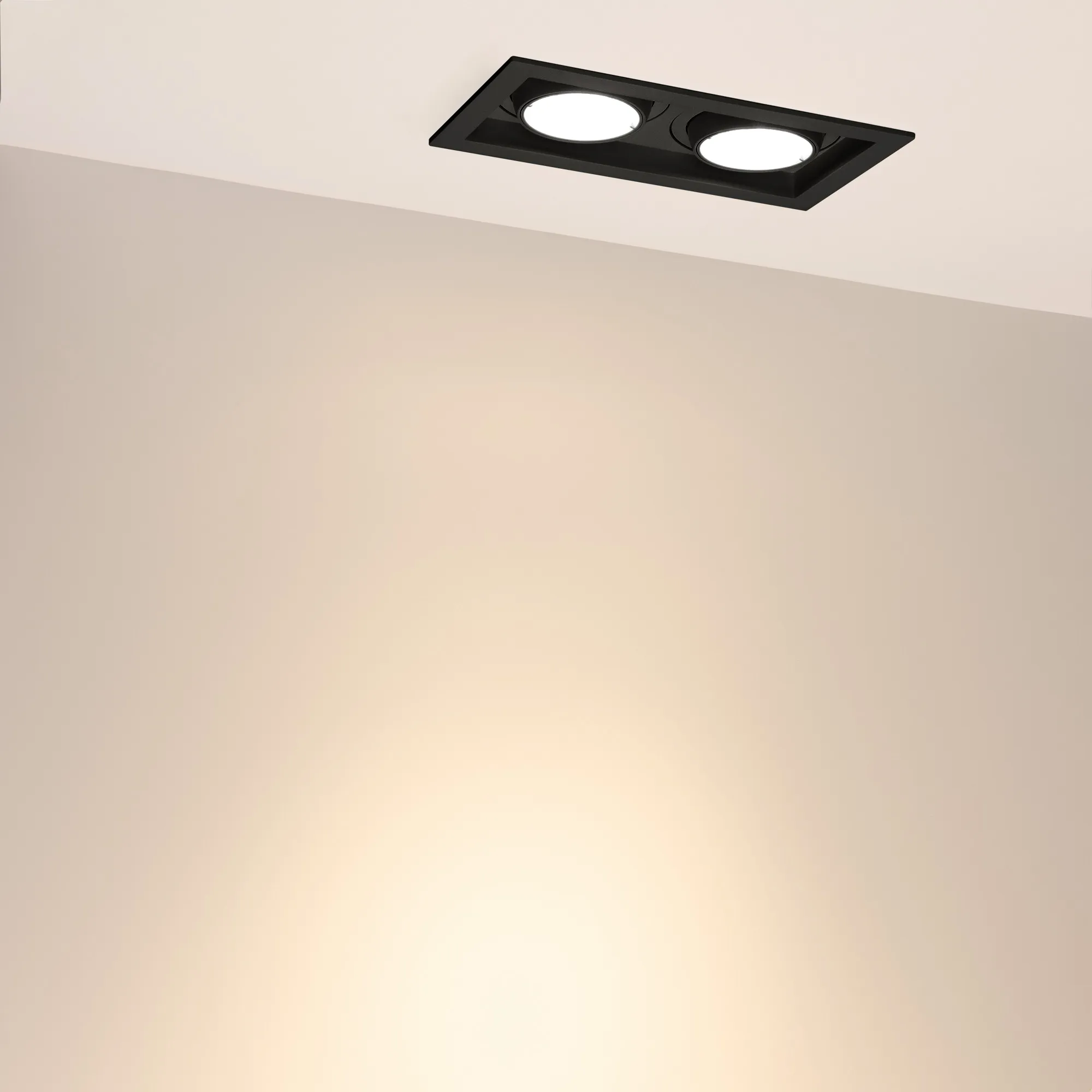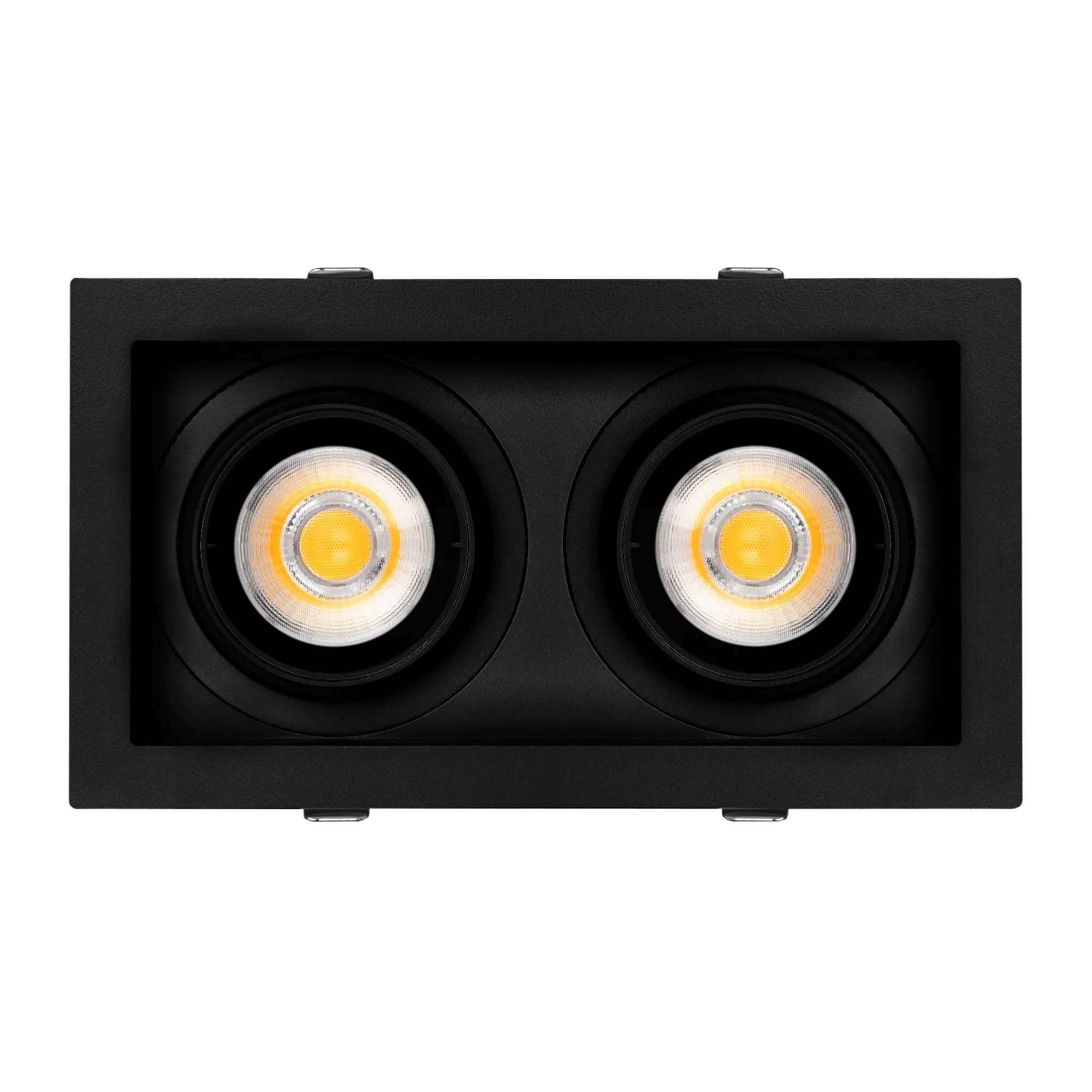 Поставка под заказ от 30 шт. Встраиваемый карданный светильник. Мощность 2х20 Вт, св. поток 4264 лм, 103 лм/Вт, тёплый 3000 K, CRI>92, угол 40°, напряжение питания 230 В. Чёрный корпус из алюминия, белая вставка, степень защиты IP20. Размер: длина 210 мм, ширина 117 мм, высота 105 мм. Монтаж встраиваемый, установочное отверстие: длина 190 мм, ширина 95 мм. Драйвер 24-42 В, 500 мА, пульсация <2%.