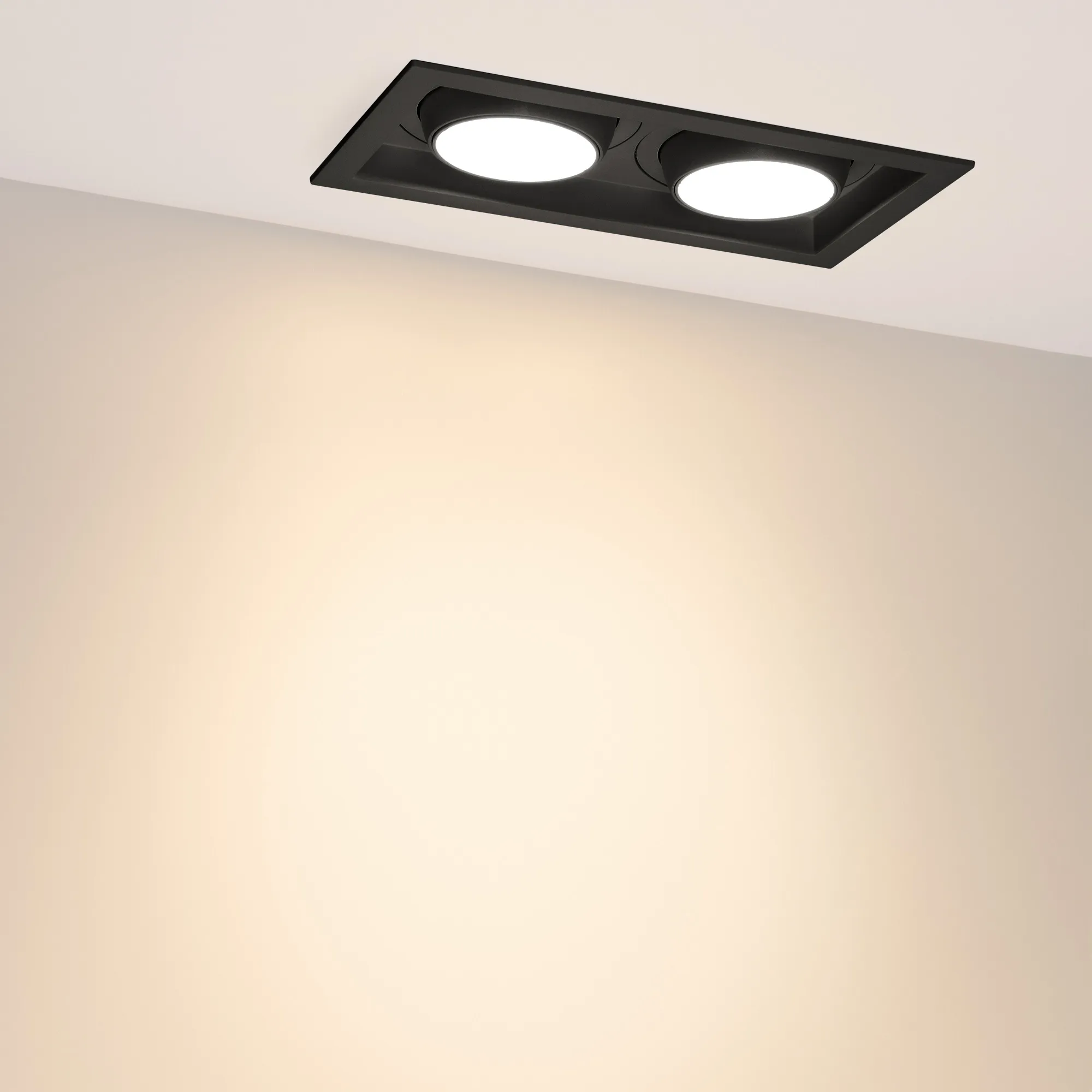 Поставка под заказ от 24 шт. Встраиваемый карданный светильник. Мощность 2х30 Вт, св. поток 5300 лм, 88 лм/Вт, тёплый 3000 K, CRI>92, угол 50°, напряжение питания 230 В. Чёрный корпус из алюминия, черная вставка, степень защиты IP20. Размер: длина 250 мм, ширина 140 мм, высота 125 мм. Монтаж встраиваемый, установочное отверстие: длина 230 мм, ширина 120 мм. Драйвер 24-42 В, 750 мА, пульсация <2%.