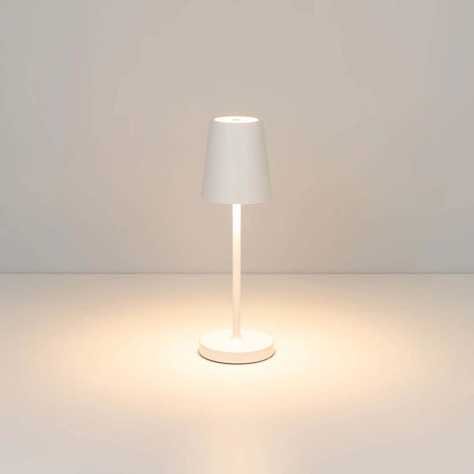 Настольный светильник со встроенным аккумулятором 1.5Вт, алюминиевый корпус, цвет белый. Цвет ТЕПЛЫЙ БЕЛЫЙ 2200-2700-3000K, св.поток 110-130 лм, CRI(Ra)>80, угол 90°. Размер Ф75x250мм. IP54. Зарядка от сети переменного тока AC220-240V. Тип встроенного аккумулятора 1500мАч Li-ion, напряжение батареи 3.7V